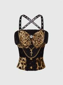 J-Fashion Y2K Gyaru Gyaru Punk Abyss Himekaji Furry Leopard Print Cross Chain Bow Decor Women Tank Top, Autumn/Winter