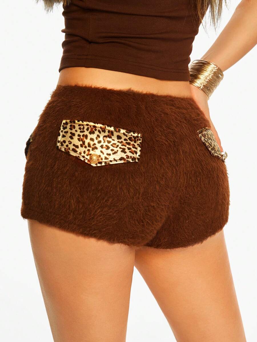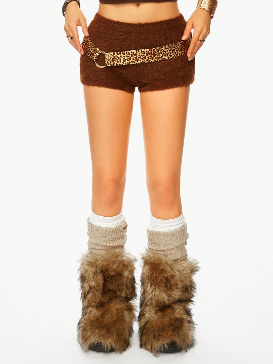 J-Fashion Y2K Gyaru Harajuku Style Fluffy Tube Top & Pu Leather Patchwork Shorts Women 2 Pieces Set, Autumn/Winter