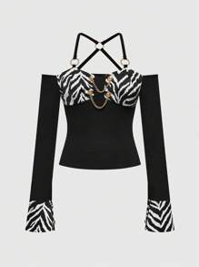 J-Fashion Y2K Retro Gyaru Shibuya Gal Sexy Zebra Stripe Halter Neck Off-Shoulder Splicing Chain Decor Women T-Shirt