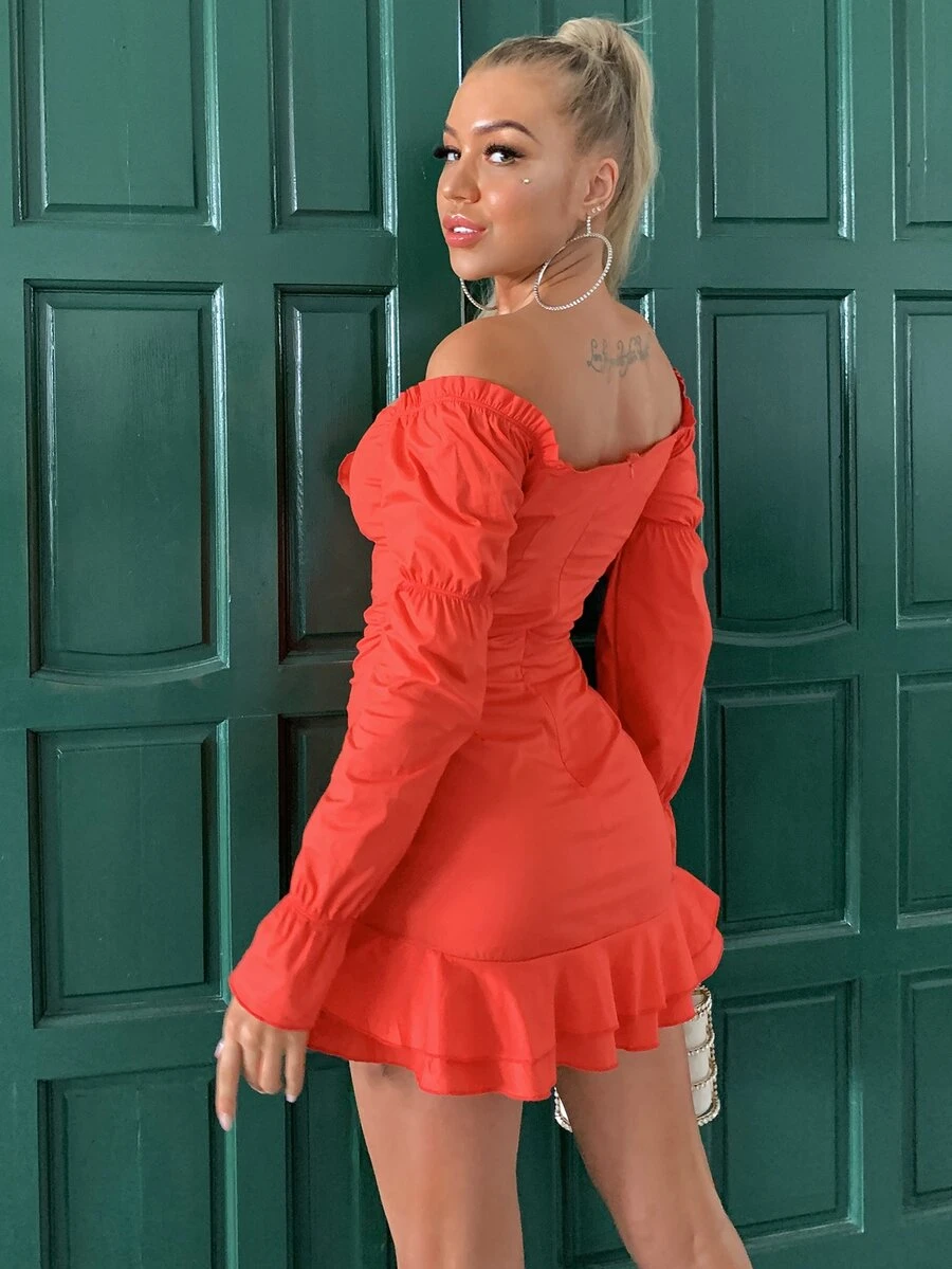 Joyfunear Neon Red Off Shoulder Ruffle Trim Satin Dress
