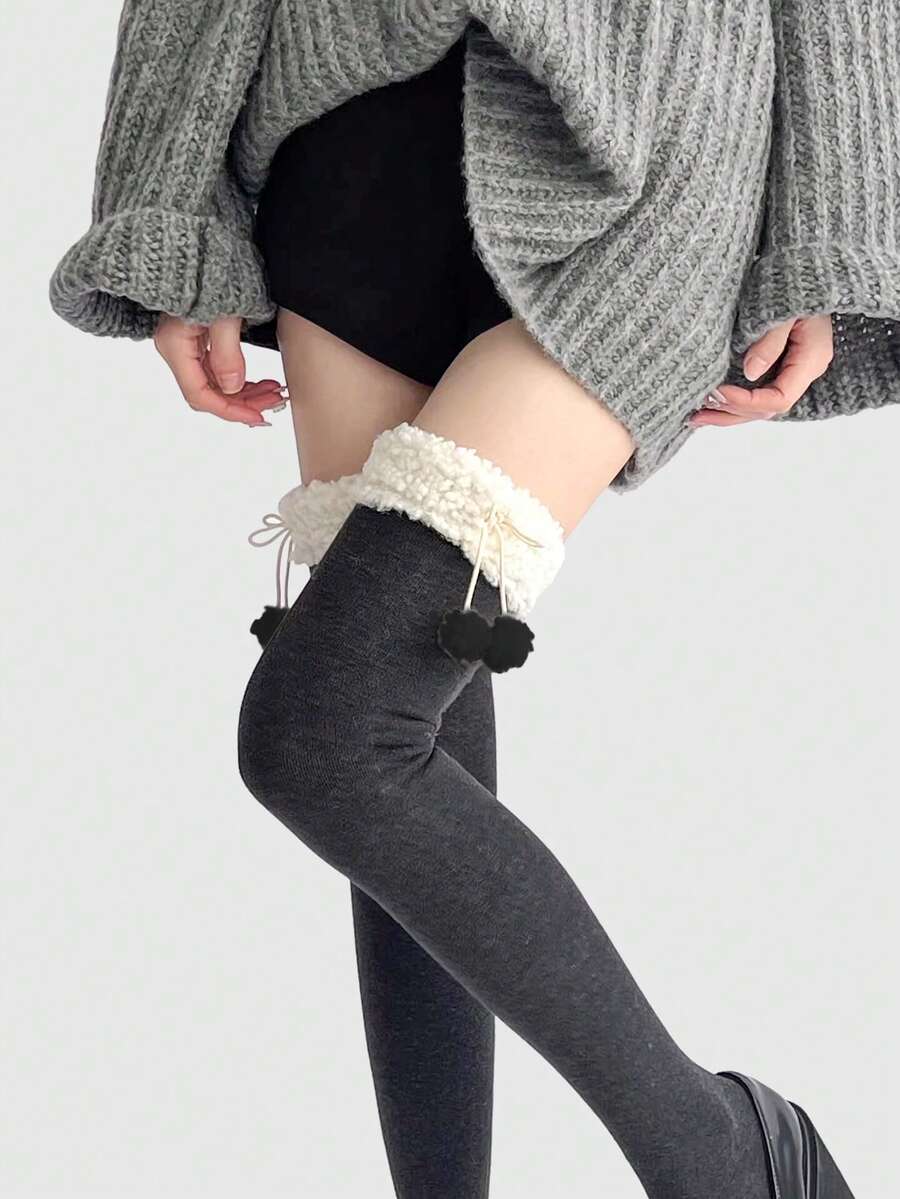 Kawaii 1 Pair Fuzzy Pom Pom Sherpa Lined Over-The-Knee Socks For Women, Warm