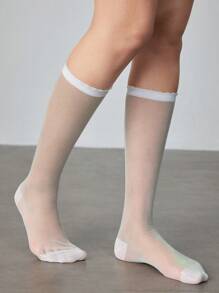 Kawaii 1 Pair Minimalist White Metallic Stripe Knee-High Socks, Cute Lace Trim JK Style Leg Warmers, Versatile Solid Color Socks For Daily Wear