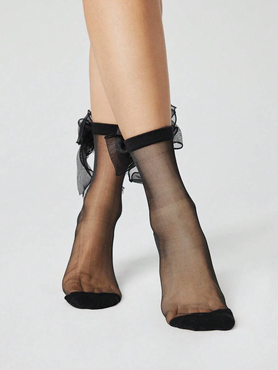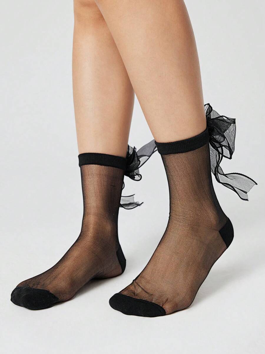 Kawaii 1 Pair Women's Black Ballet Style Double-Layer Tulle Bow Crystal Glass Socks, All Season