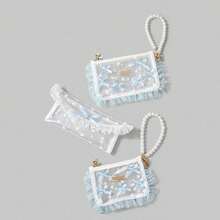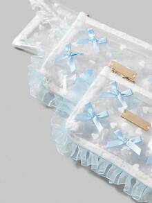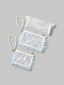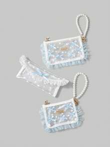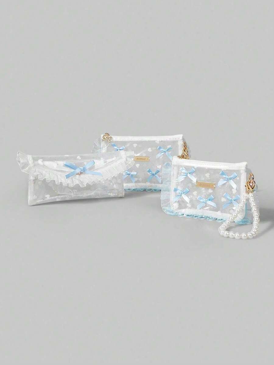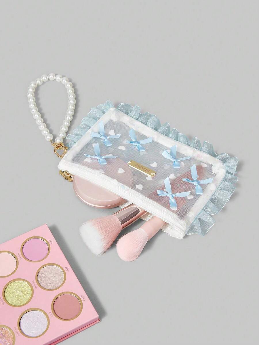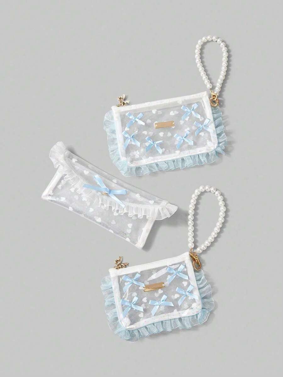 Kawaii 1 Pc Heart & Bow Knot Pearl Chain Decor PVC Clear Lace Handbag Cosmetic Pouch Coin Purse Earphone Lipstick Jewelry Organizer, Gift For Travel