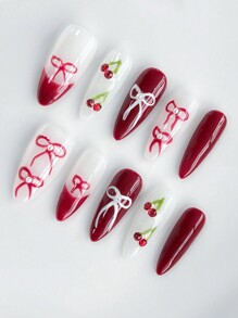 Kawaii 10pcs Cute Cherry Style Handmade False Nails + 3pcs Double Sided Tape, Removable Y2K Butterfly Hand-Painted Nail Stickers, High-Quality Fruit Color Nail Art, Suitable For Festival, Party, Dance And Daily Wear