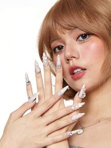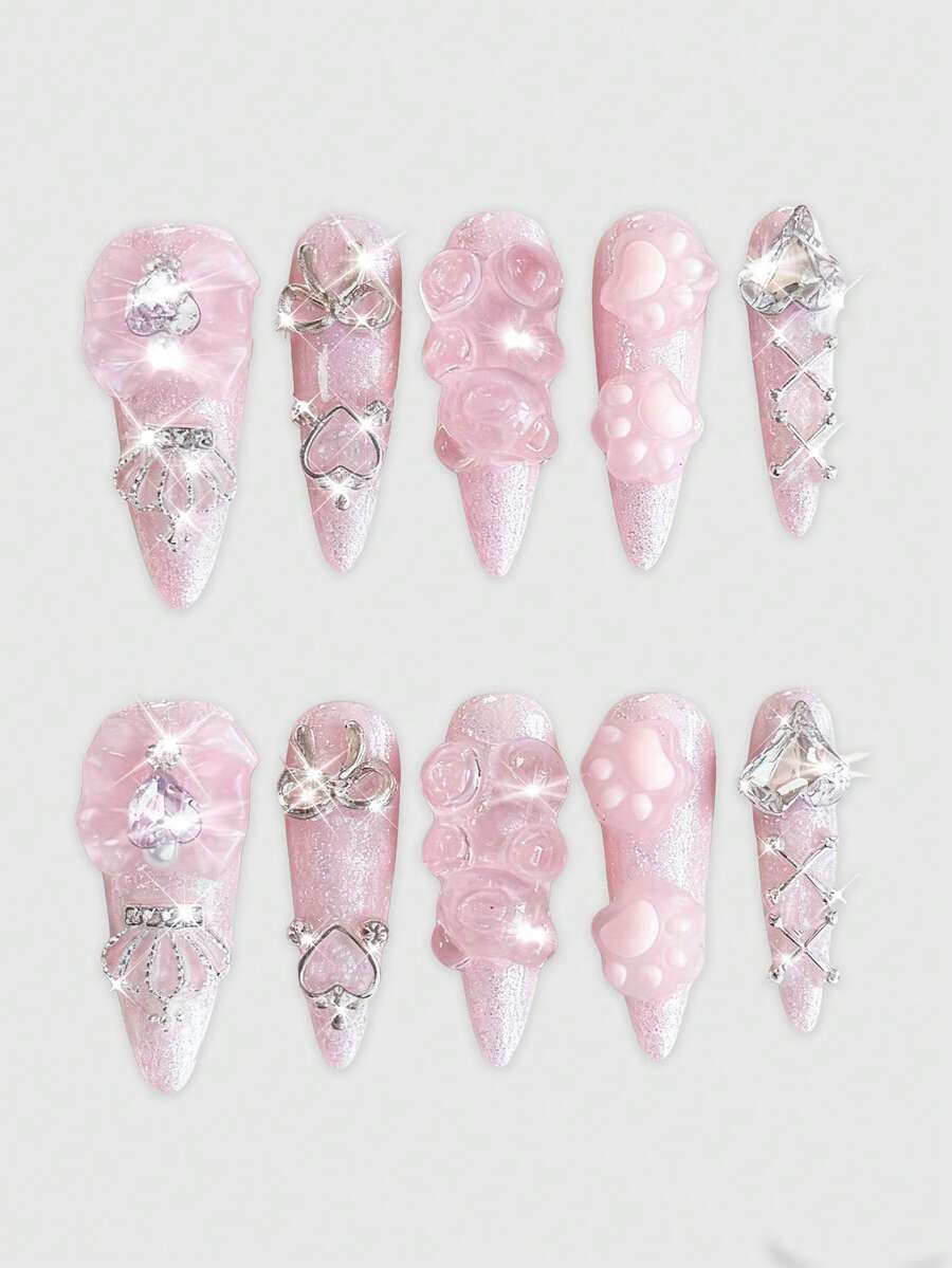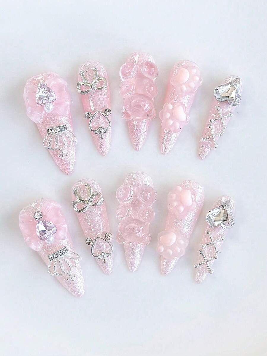 Kawaii 10pcs Cute Style Bear Handmade False Nails + 3pcs Double-Sided Tape, Removable Y2K Bow Hand-Painted Nail Stickers, High-Quality Color Block Nail Art, Suitable For Festival Parties, Dance And Daily Wear ,Pink