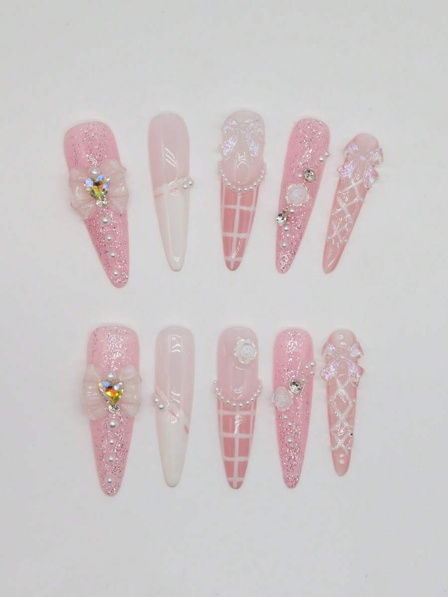 Kawaii 10pcs Cute & Sweet Style Pearl Heart Rose Diamond Hand Painted High-Quality Fake Nails + 3pcs Double-Sided Adhesive, Removable & Reusable Rhinestone Glitter Contrast Line Nail Stickers, Suitable For Holidays, Parties, Dance, Daily Wear
