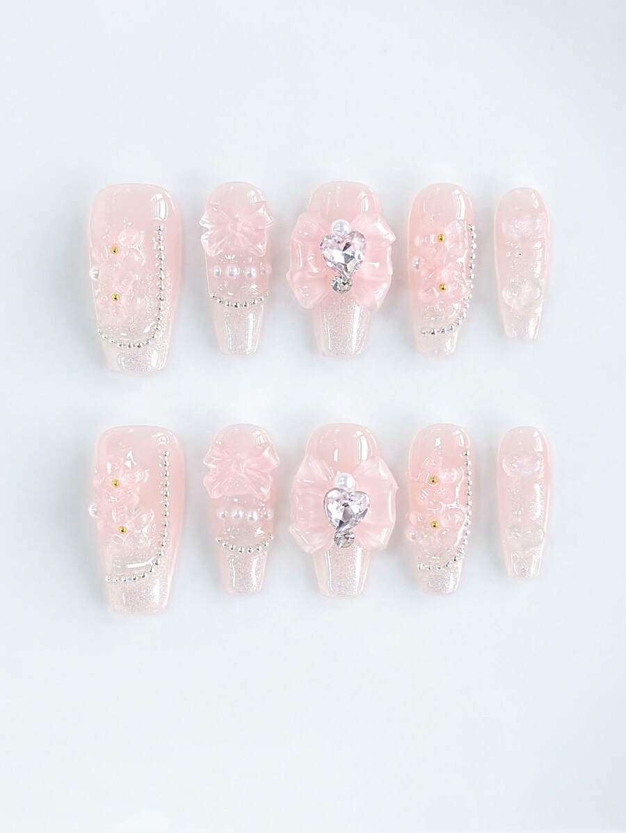 Kawaii 10pcs Pink-Toned Bowknot Nail Decals + 3 Sheets Double-Sided Adhesive, Cute Style Rhinestone Nail Art Sticker, High-Quality Glossy Nail Decals, Suitable For Holidays, Parties, Dancing And Daily Wear