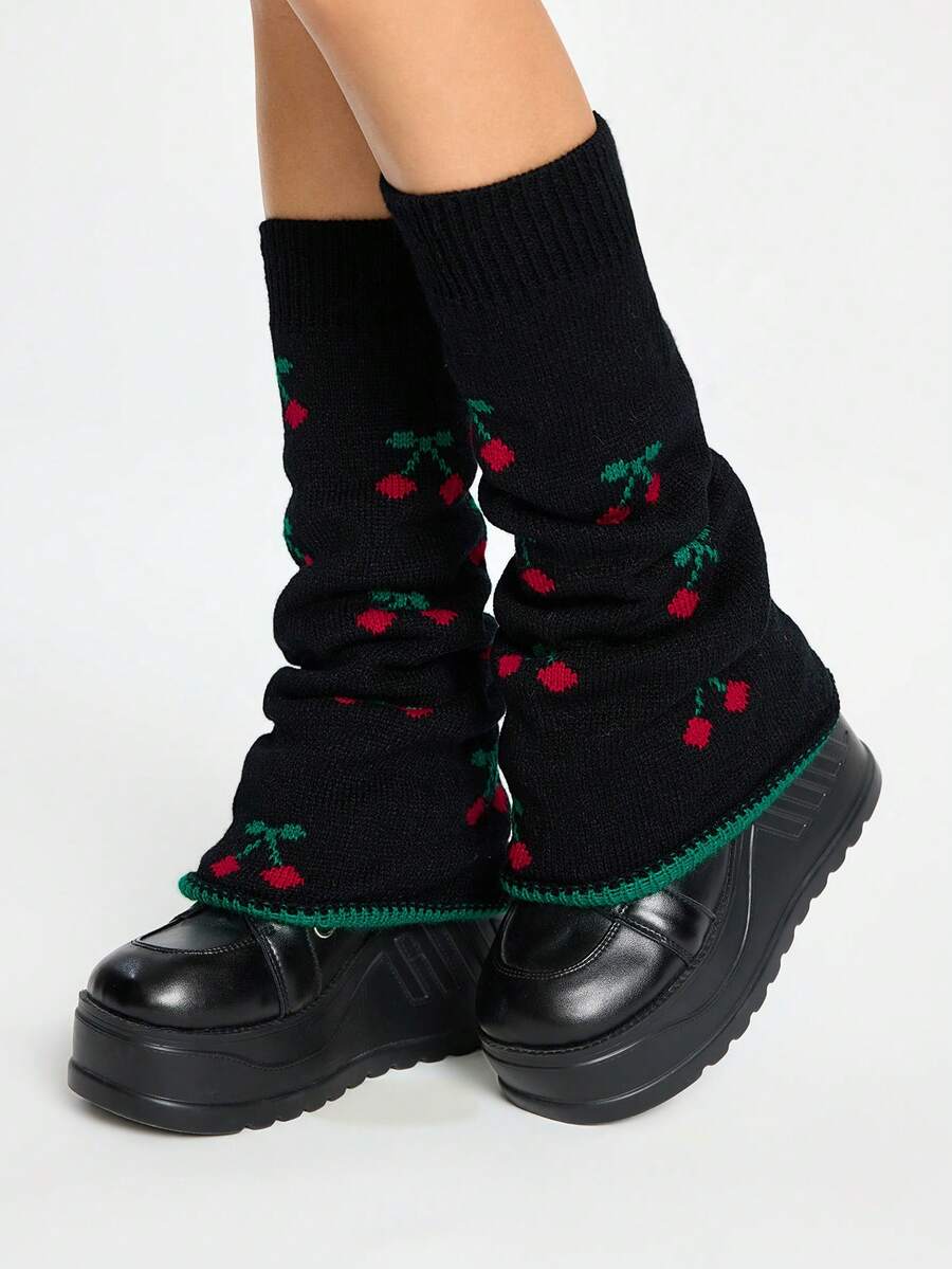 1pair Sweet Kawaii Multiple Mini Cherry Pattern Black Flared Leg Warmers