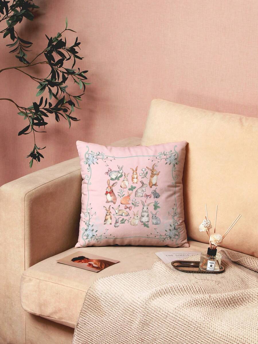 Kawaii 1pc Beautiful Pink Rabbit Butterfly Print Floral Pattern Pillowcase, No Pillow Core, Velvet Printed Square Throw Pillowcase, Suitable For Daily Living Room And Bedroom Decoration, Sofa Cushion Cover, Car Cushion Cover, All Seasons