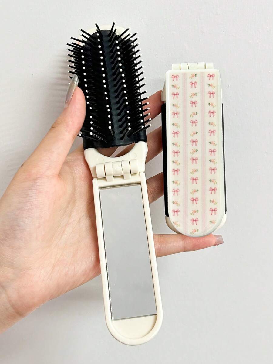 Kawaii 1pc Butterfly & Floral Print Folding Hair Brush With Mirror, Random Pattern