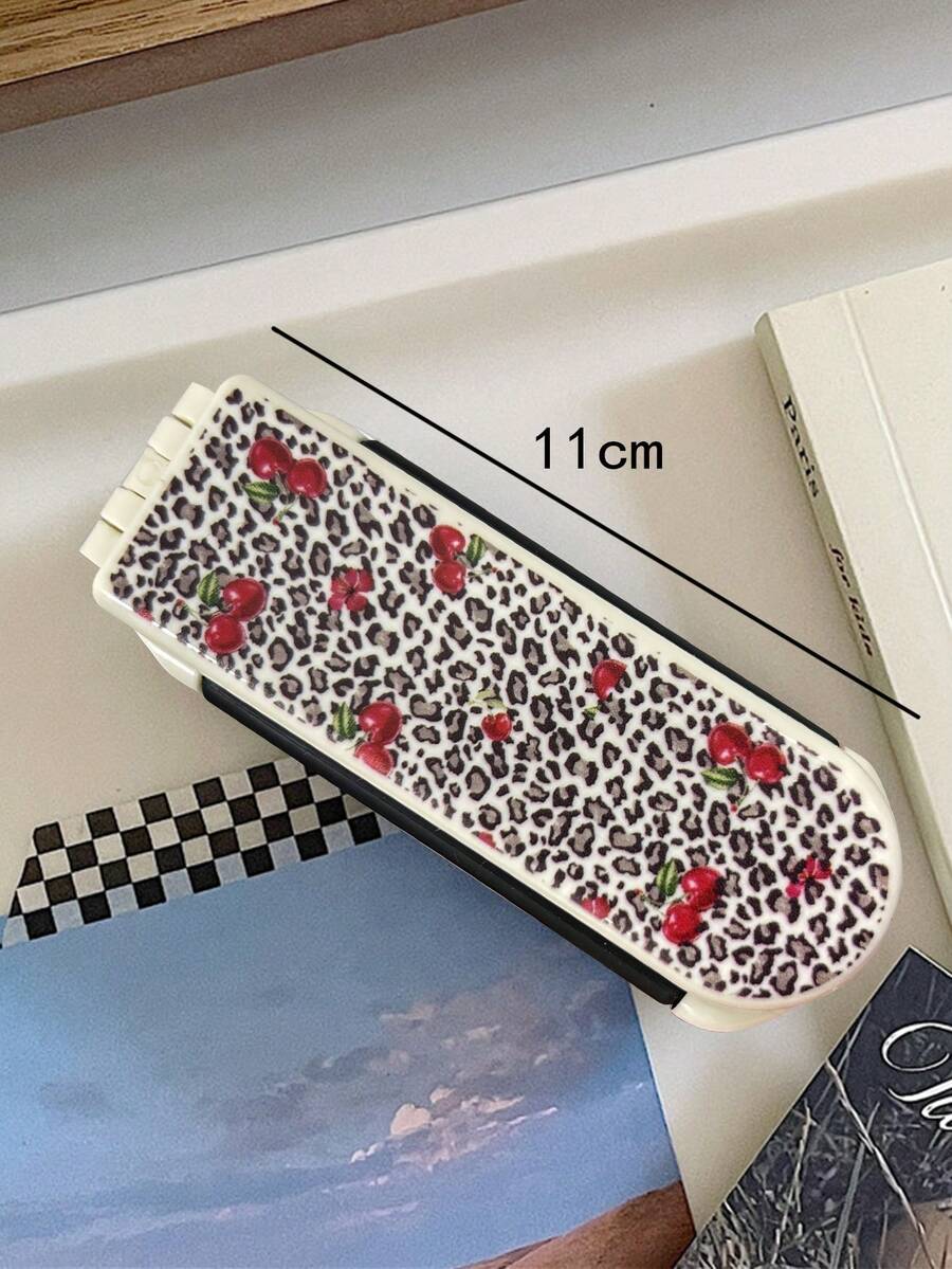 Kawaii 1pc Cherry Leopard Print Back To School Folding Hairbrush With Mirror Portable Compact Hair Brush