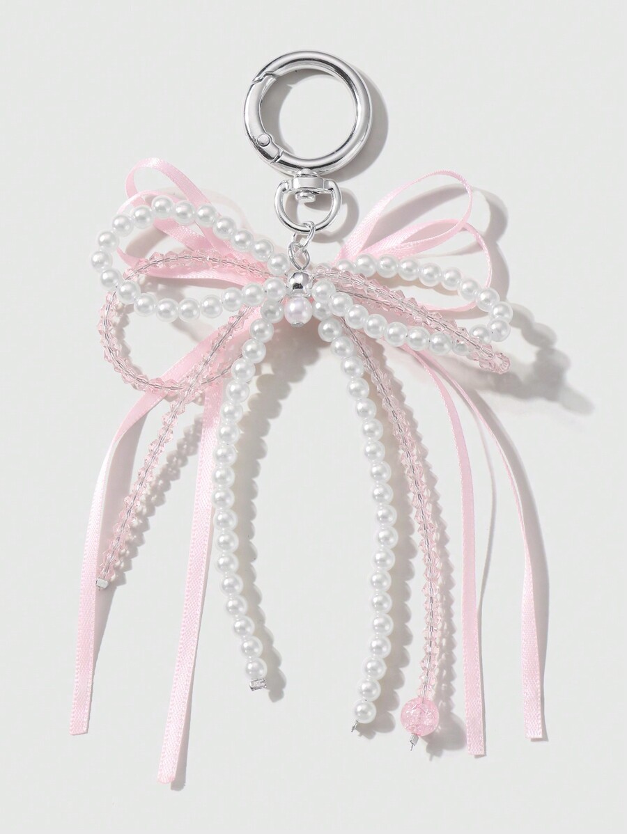 Kawaii 1pc Elegant & Cute Luxury Versatile High Quality Handmade Beaded White Faux Pearl, Faux Crystal, Ribbon Bow Keychain, Suitable For Girls/Women Everyday Wear, Holiday Gift