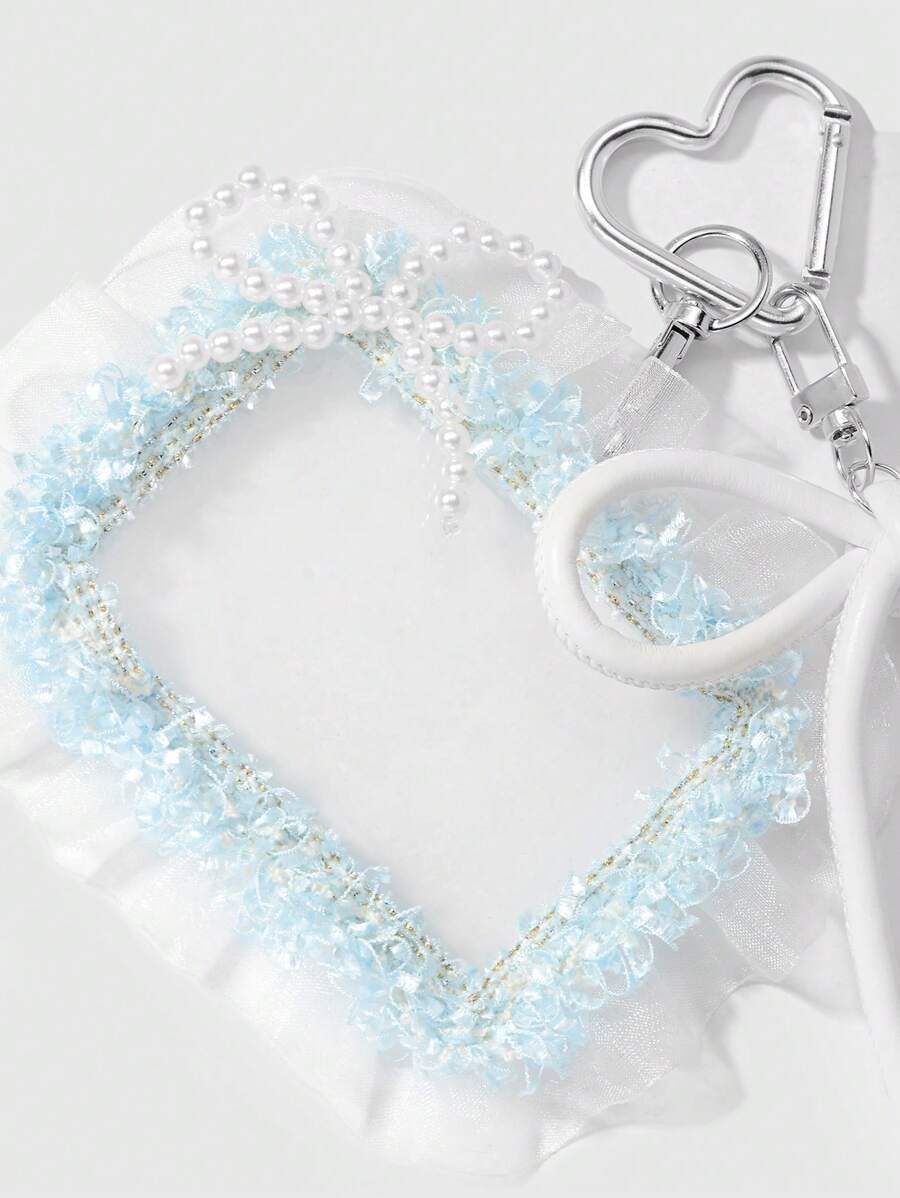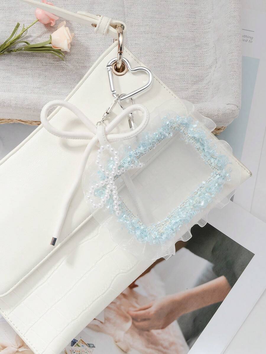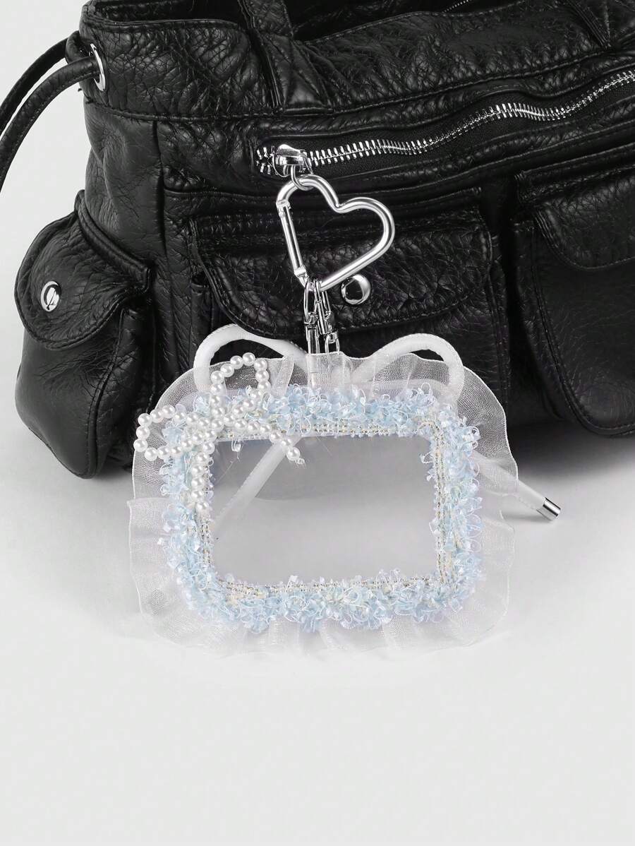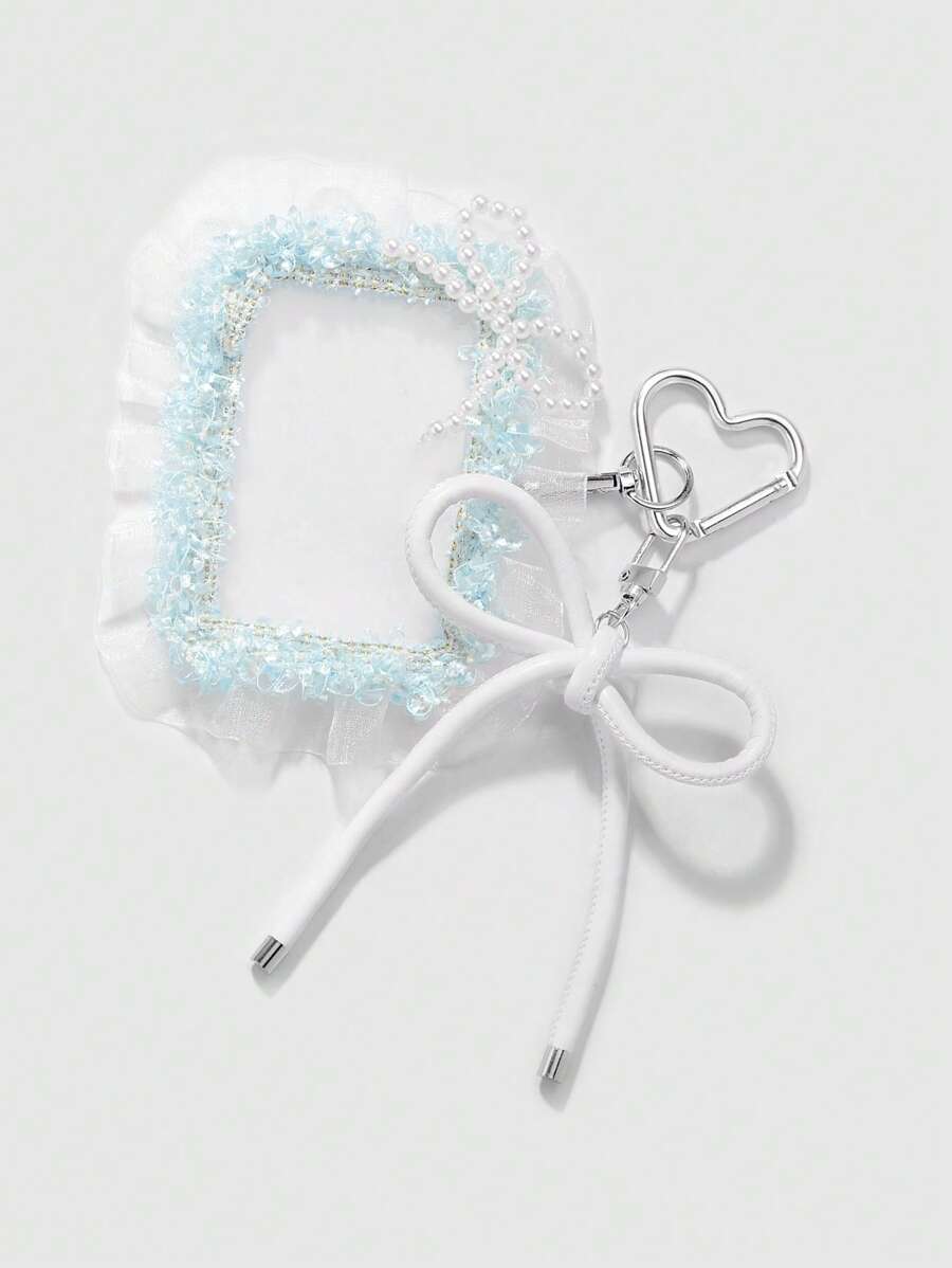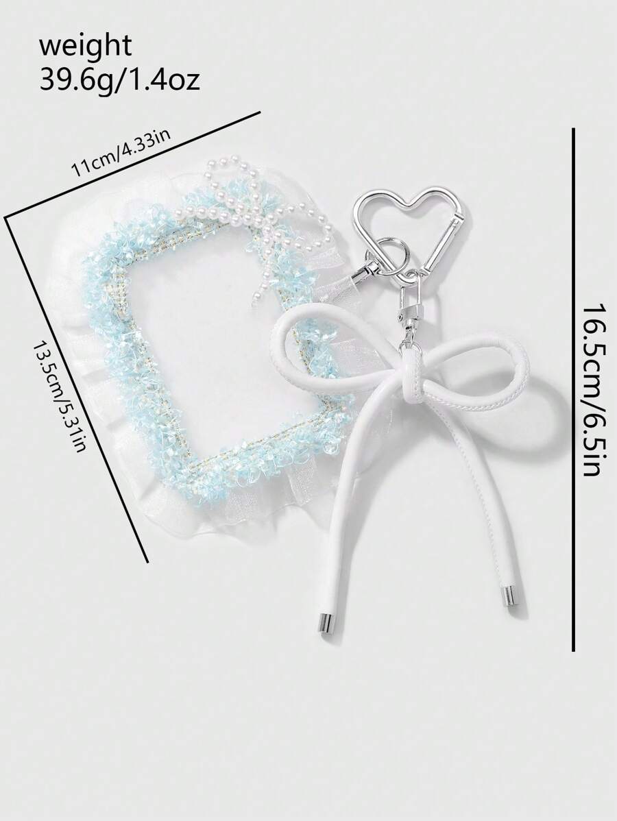 Kawaii 1pc Elegant & Fashionable Handmade Beaded White Faux Pearl Leather Bow Decor Blue Lace Net Transparent Card Holder, Suitable For Office Workers, Students, Daily Wear, Holiday Gift - Keychain, Bag Charm