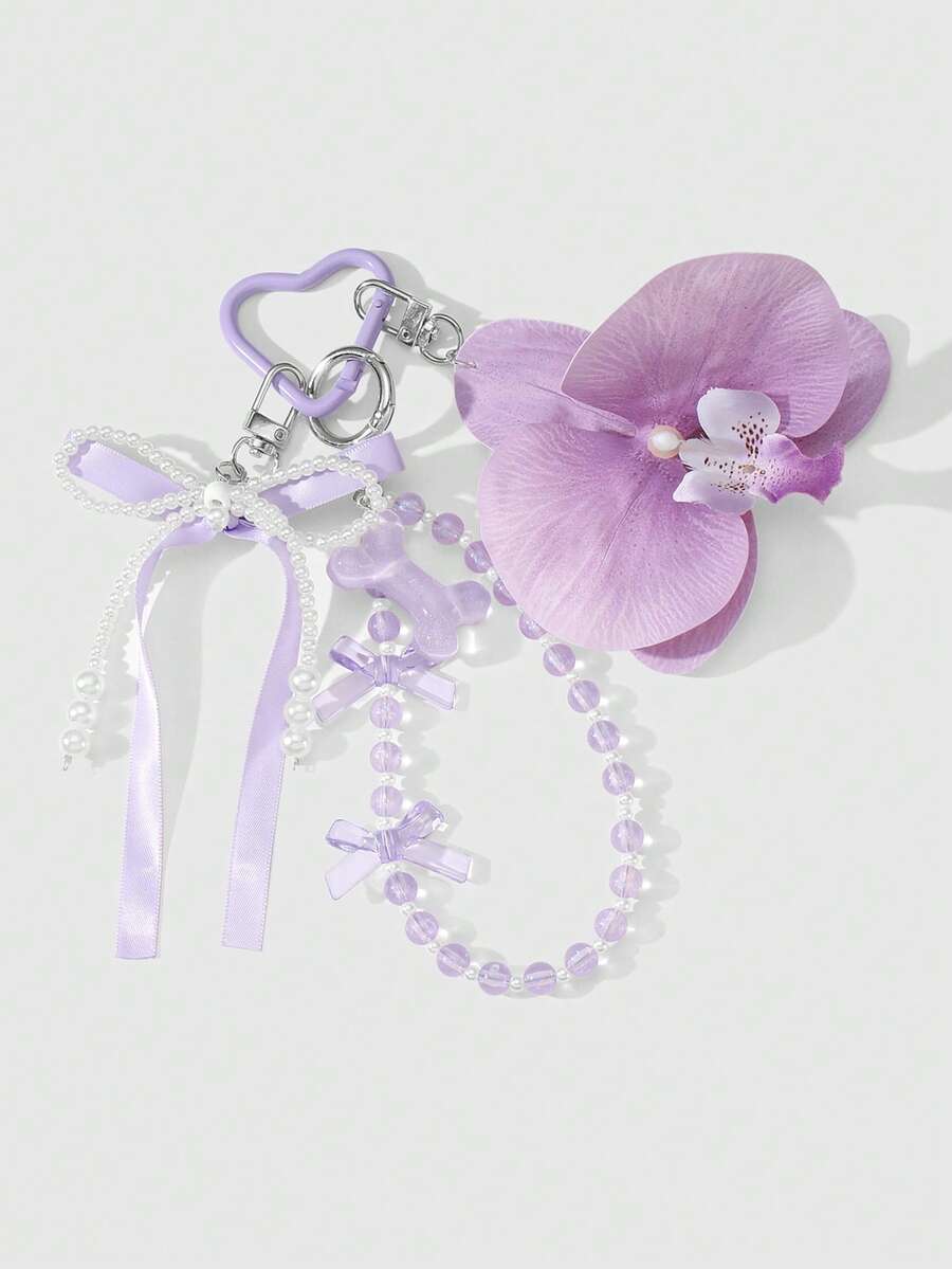 Kawaii 1pc Elegant Versatile Cute High-Quality Vacation Chiffon Purple Orchid Handmade Beaded Faux Pearl Ribbon Resin Bowknot Shiny Round Bead Bone Decor For DIY Keychain, Bag Charm, Phone Strap, Great Gift For Women