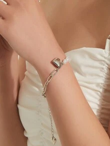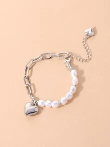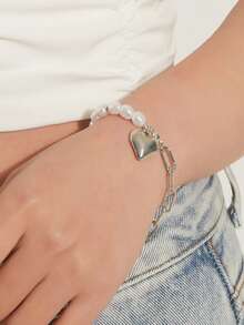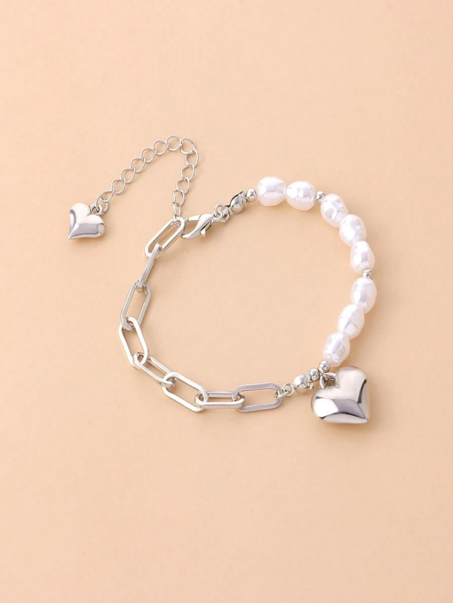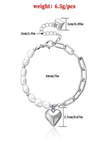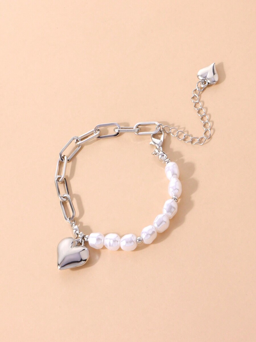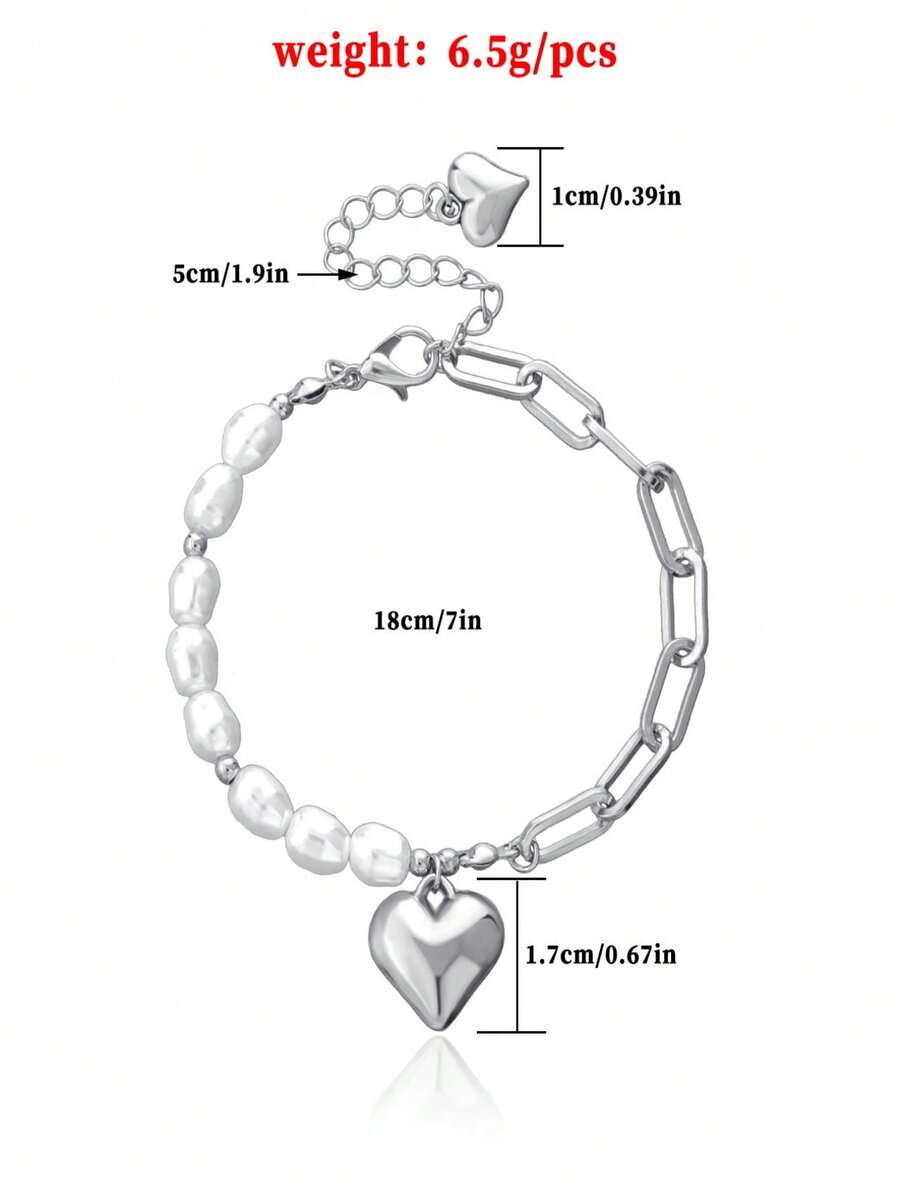 Kawaii 1pc Fashion Stainless Steel Heart Charm Faux Pearl Decor Bracelet For Women For Daily Decoration