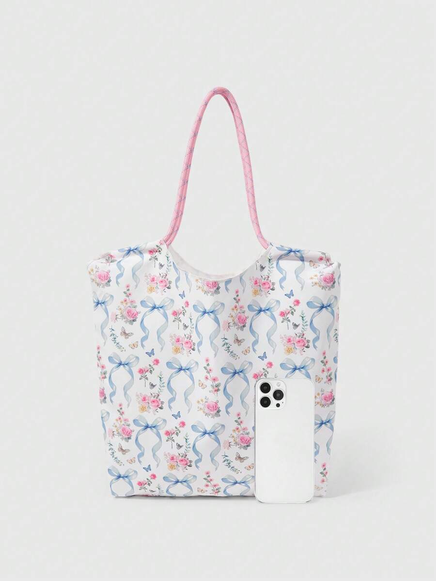 Kawaii 1pc Floral Bow Decor Women Tote Bag