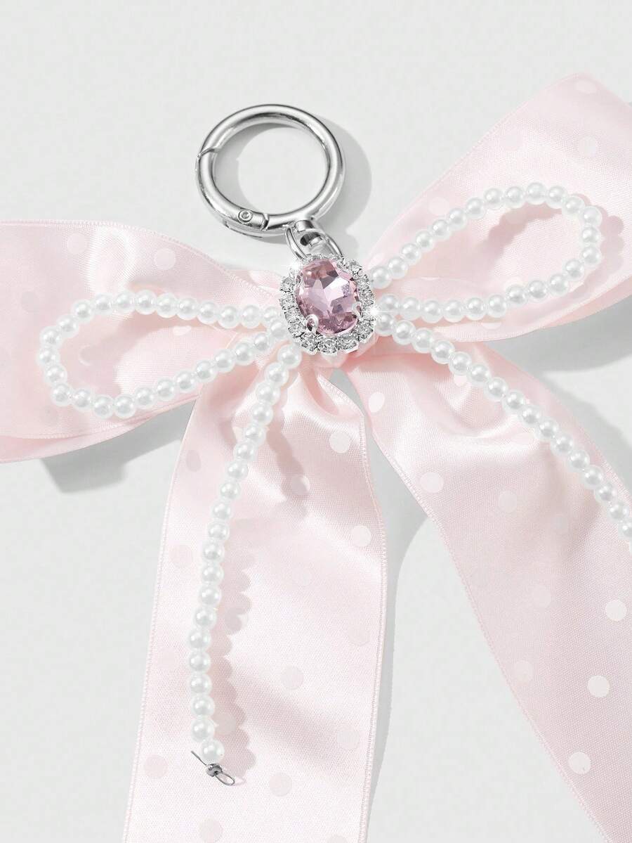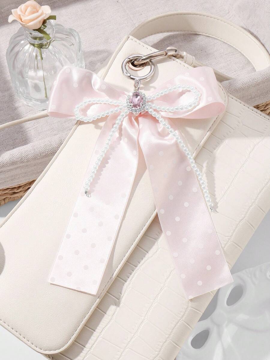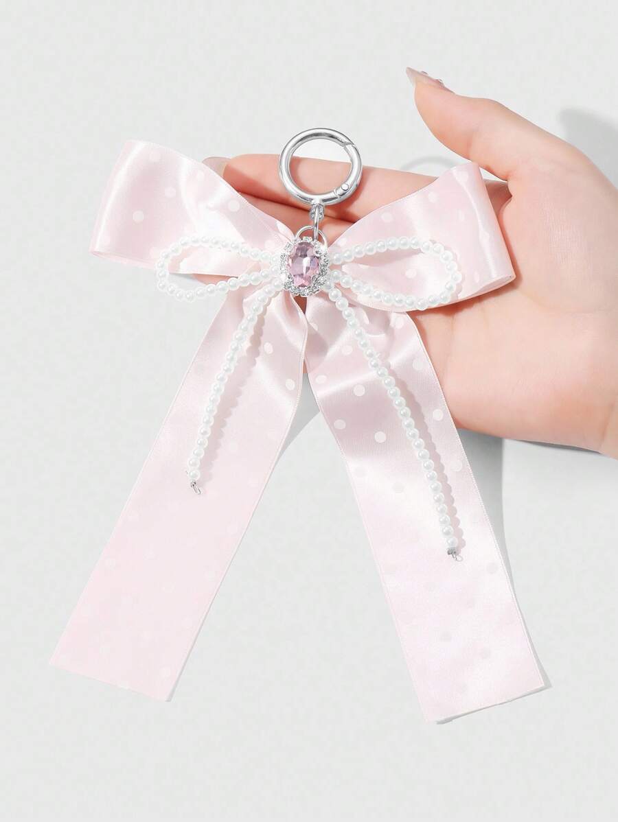 Kawaii 1pc Handmade Delicate Cute Girl Simple High Quality High-End White Faux Pearl Crystal Pink Polka Dot Ribbon Bow Keychain Bag Pendant, Suitable For Women Girls Daily Wear, Festival Gift
