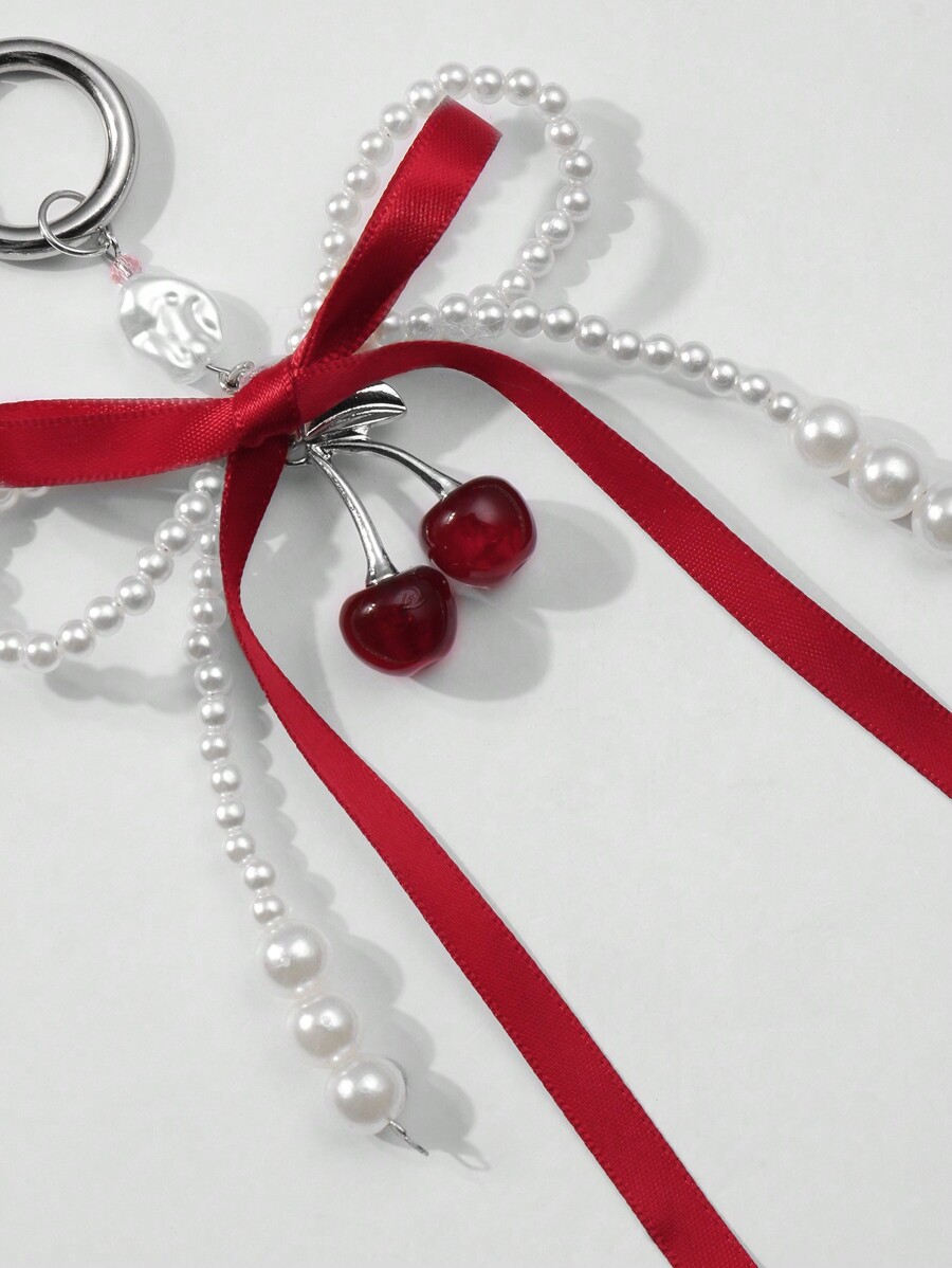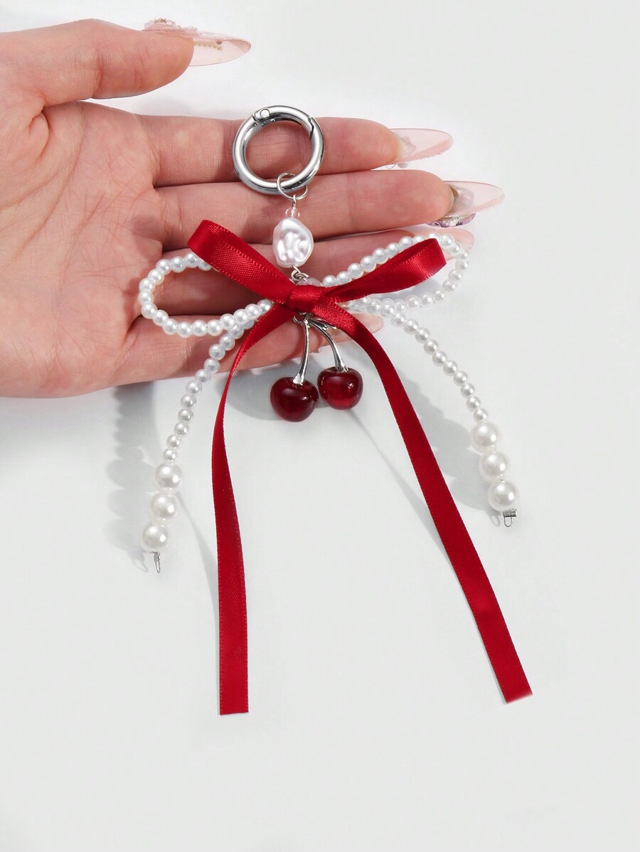 Kawaii 1pc INS Korean Style Sweet & Simple Casual Handmade Beaded White Faux Pearl & Red Ribbon Bow Faux Cherry Pendant Keychain Bag Charm, Suitable For Girls & Women, Gift Valentines