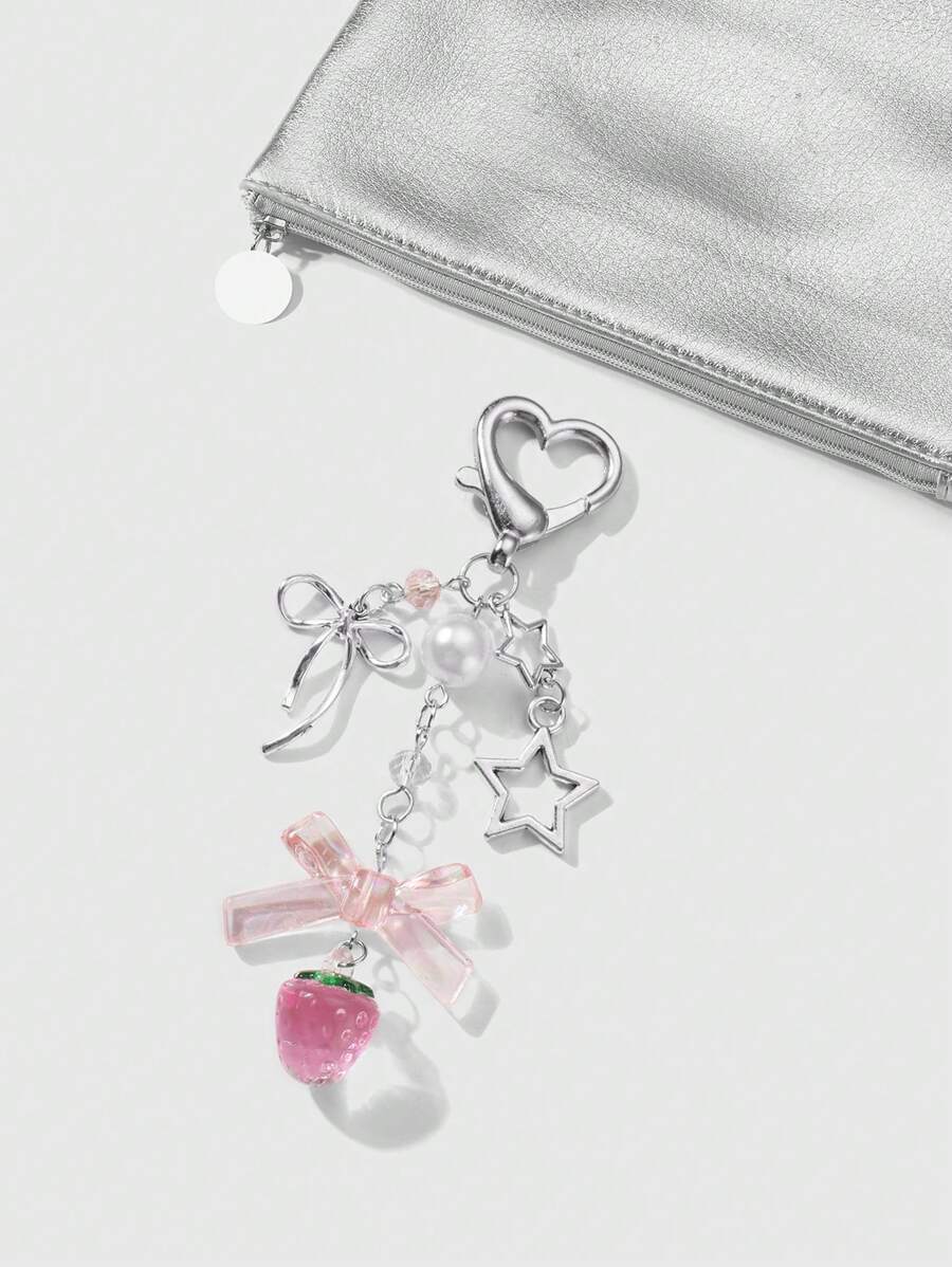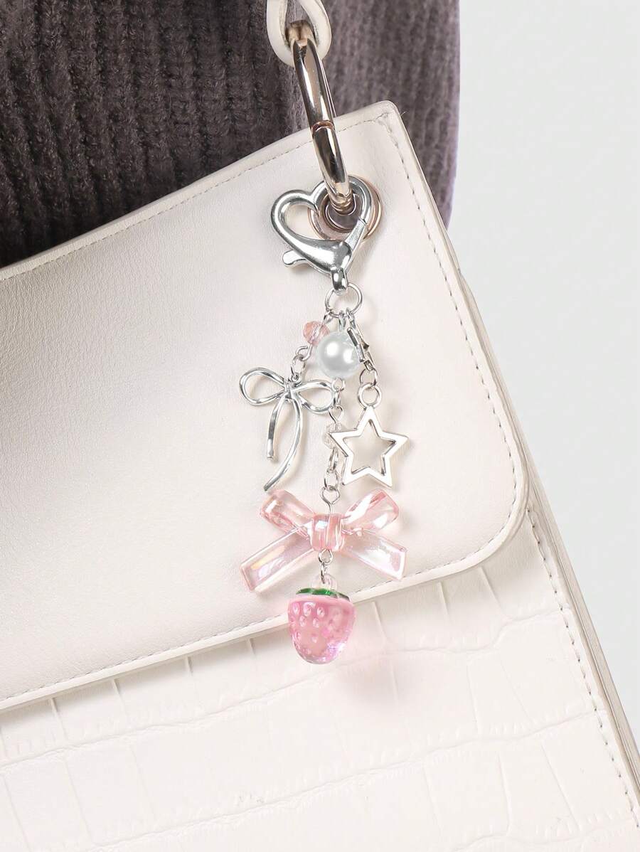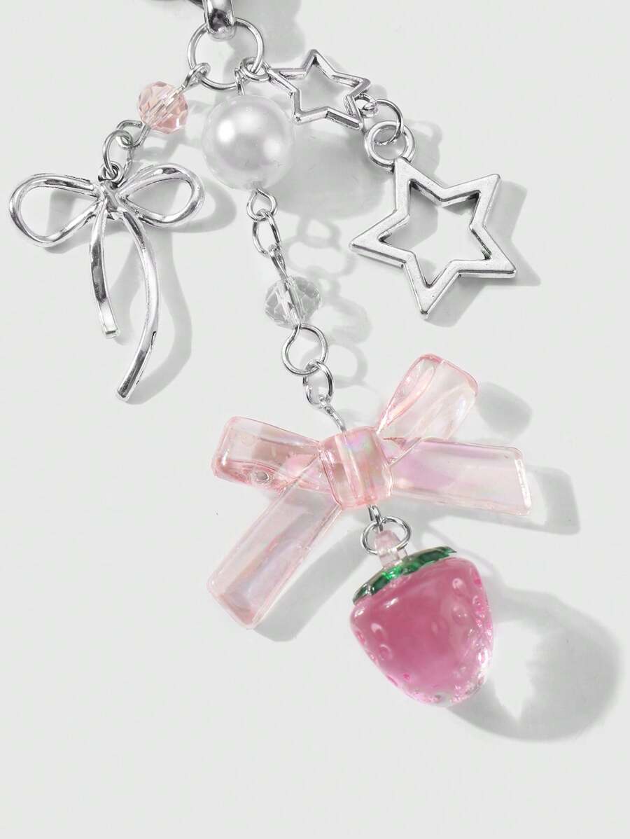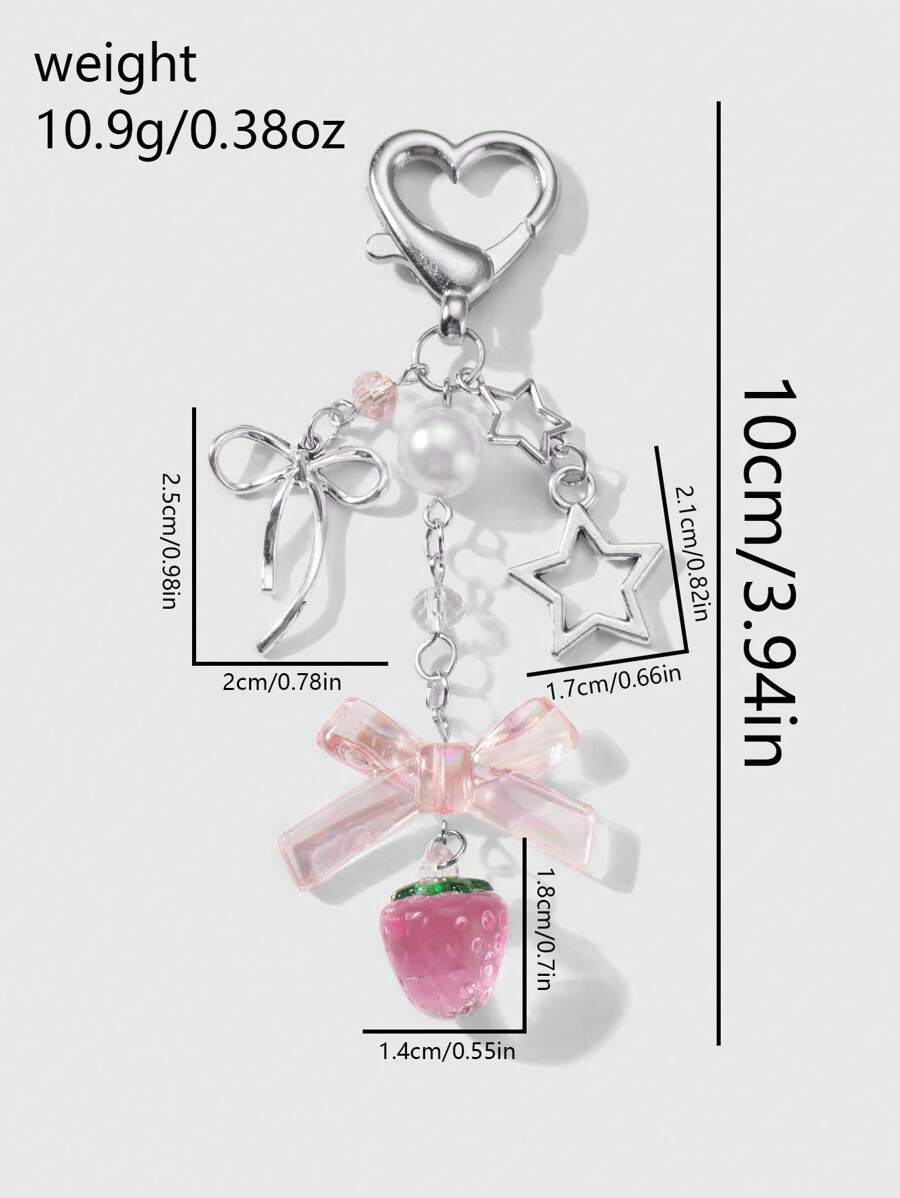 Kawaii 1pc Ins Style Delicate Minimalist Hollow Star Bow Faux Pearl Strawberry Resin Pendant Keychain, Versatile For Girls Ladies Everyday Wear, Ideal Gift