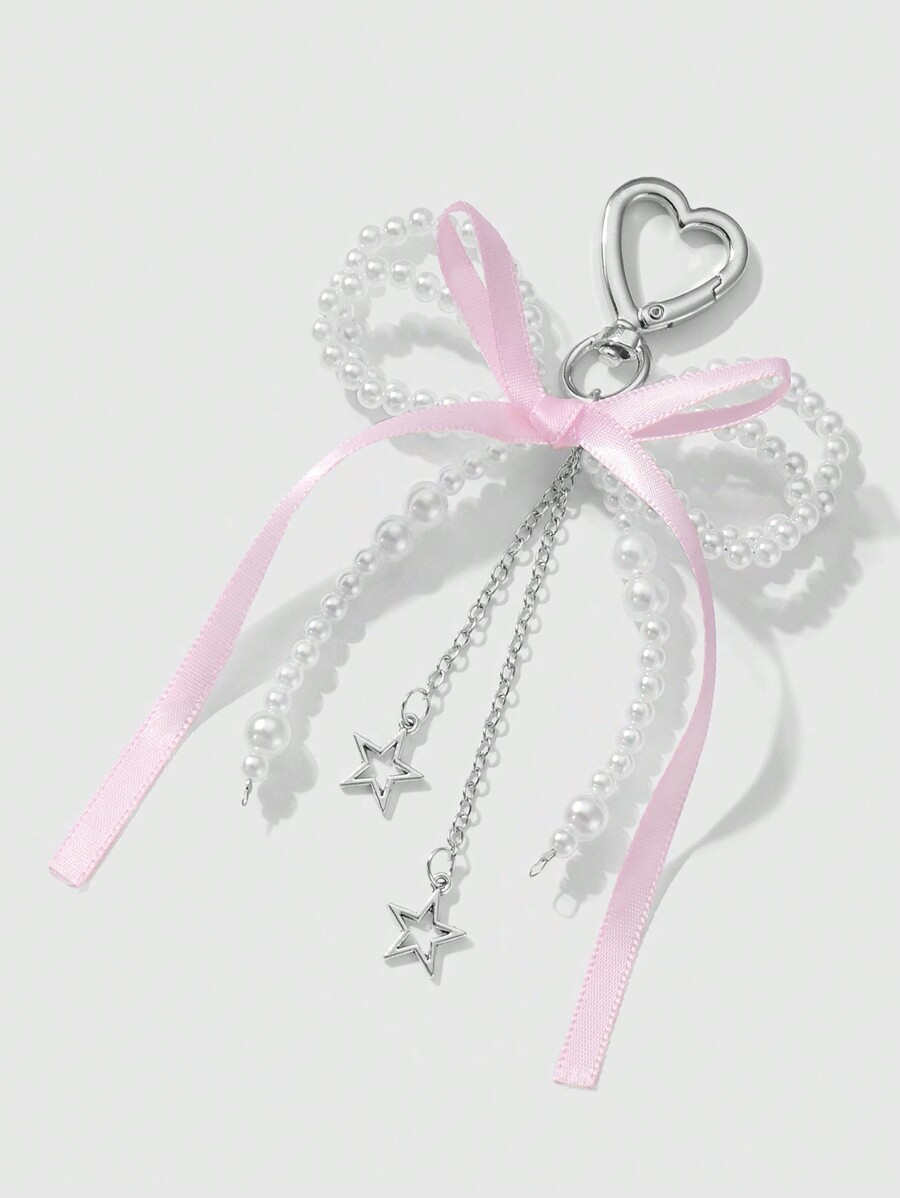 Kawaii 1pc Ins Style Sweet Girl Simple Elegant Versatile High-Quality Handmade Beaded White Faux Pearl, Pink Ribbon Bow, Silver Chain Star Pendant, Heart Keychain Bag Charm, Suitable For Women, Girls, Daily Wear, Festival Gift
