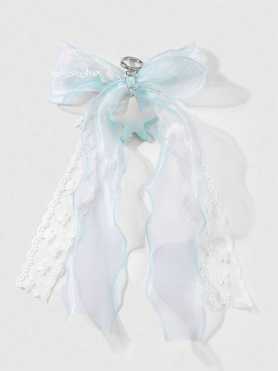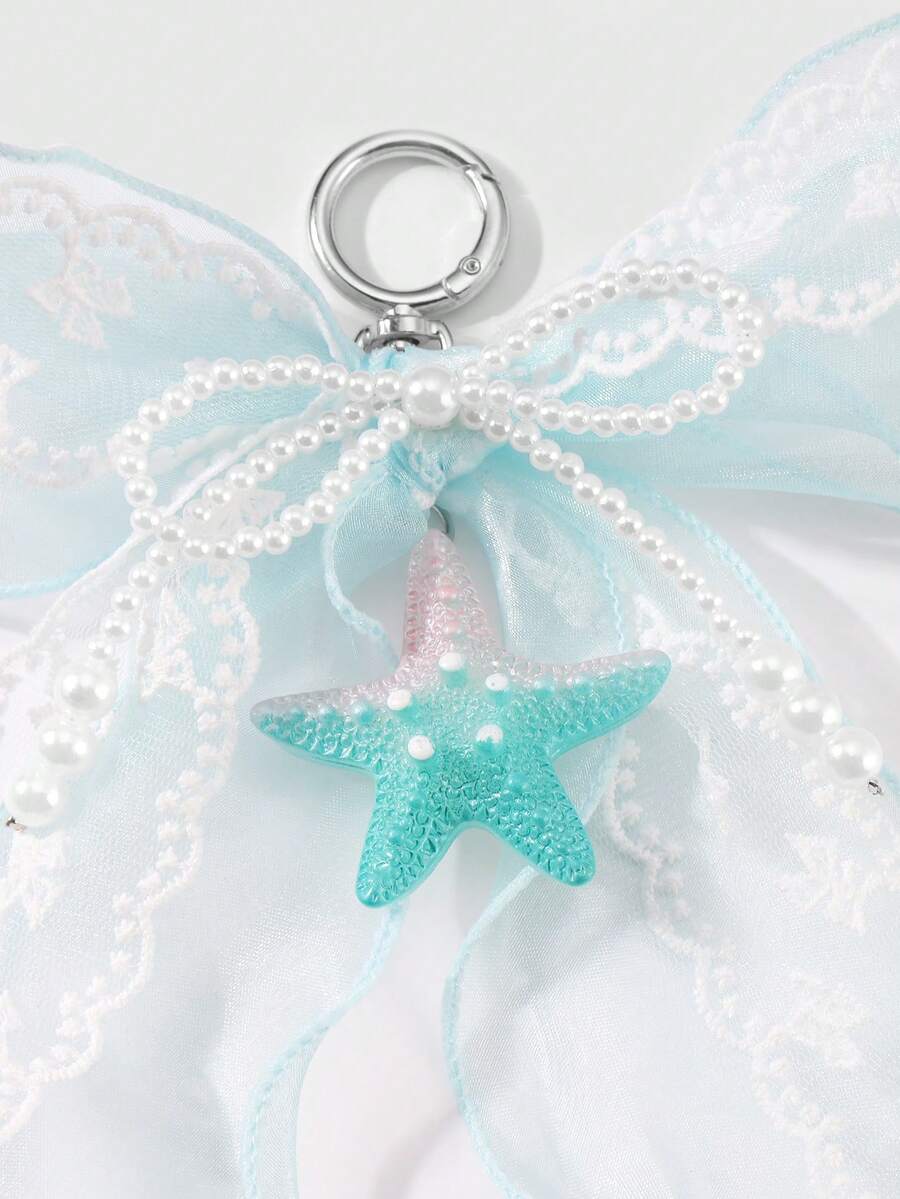Kawaii 1pc Korean Fashion Delicate High-Quality Handmade Beaded White Faux Pearl, Blue Mesh Lace Bow, Resin Dripping Oil Starfish Pendant Keychain & Key Ring, Suitable For Women, Girls, Daily Wear, Holiday Gift