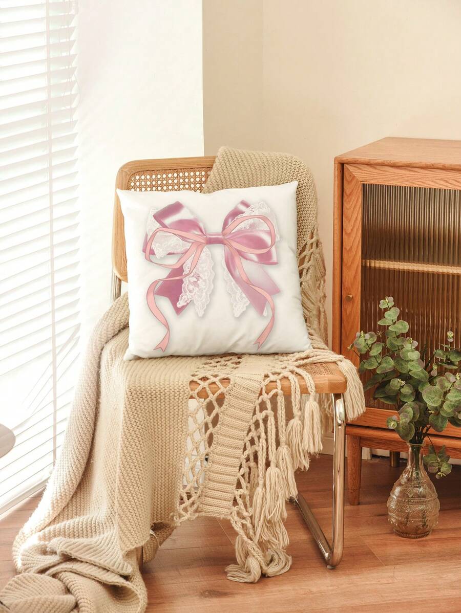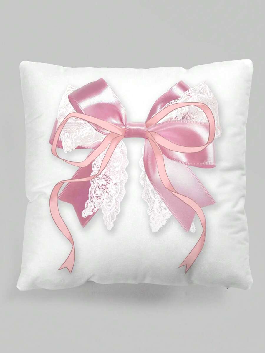 Kawaii 1pc Lace Bow Pattern Throw Pillow Cover, No Pillow Insert, Velvet Printed Square Cushion Cover, Suitable For Living Room, Bedroom, Home Decor, Sofa Throw Pillow, Car Pillow, Applicable For All Seasons, SKU 1294327