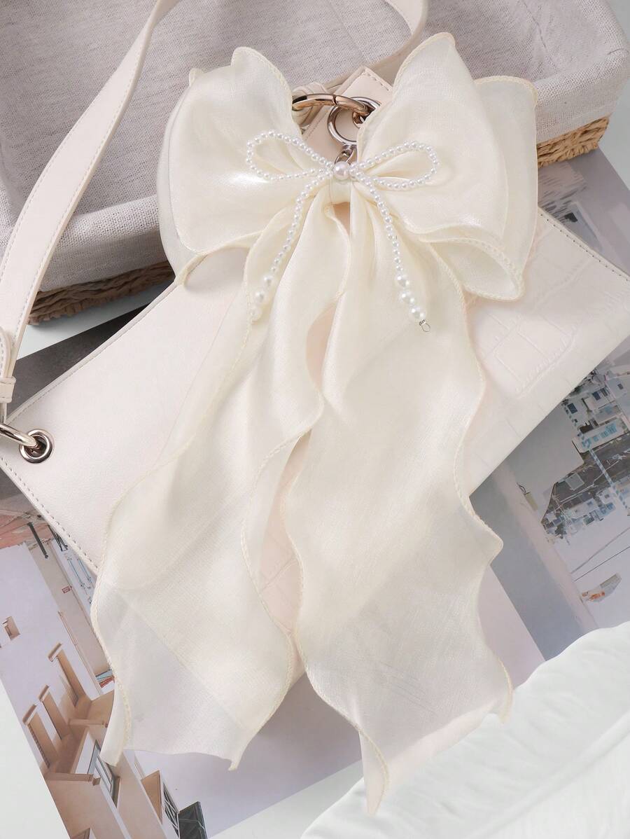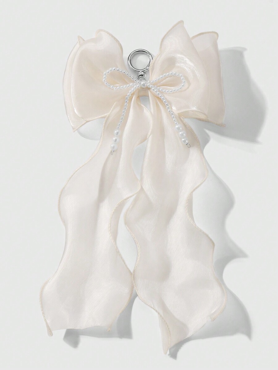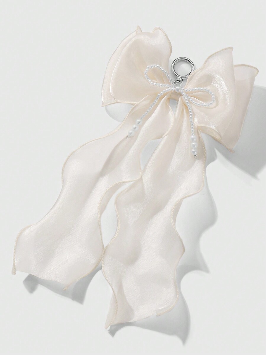 Kawaii 1pc Luxury Elegant Handcraft Beaded White Faux Pearl Net Fabric Double Bowknot Keychain, Versatile Accessories Decor, Suitable For Women, Perfect For Daily Use And Holiday Gifts