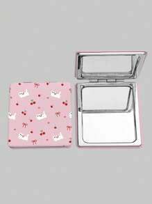 Kawaii 1pc Pink Cute Cat, Cherry, Heart And Bow Print Square PU Makeup Mirror, Portable Handheld Mirror For Girls, Suitable For Home, Travel, Outdoor (Print Placement Random)
