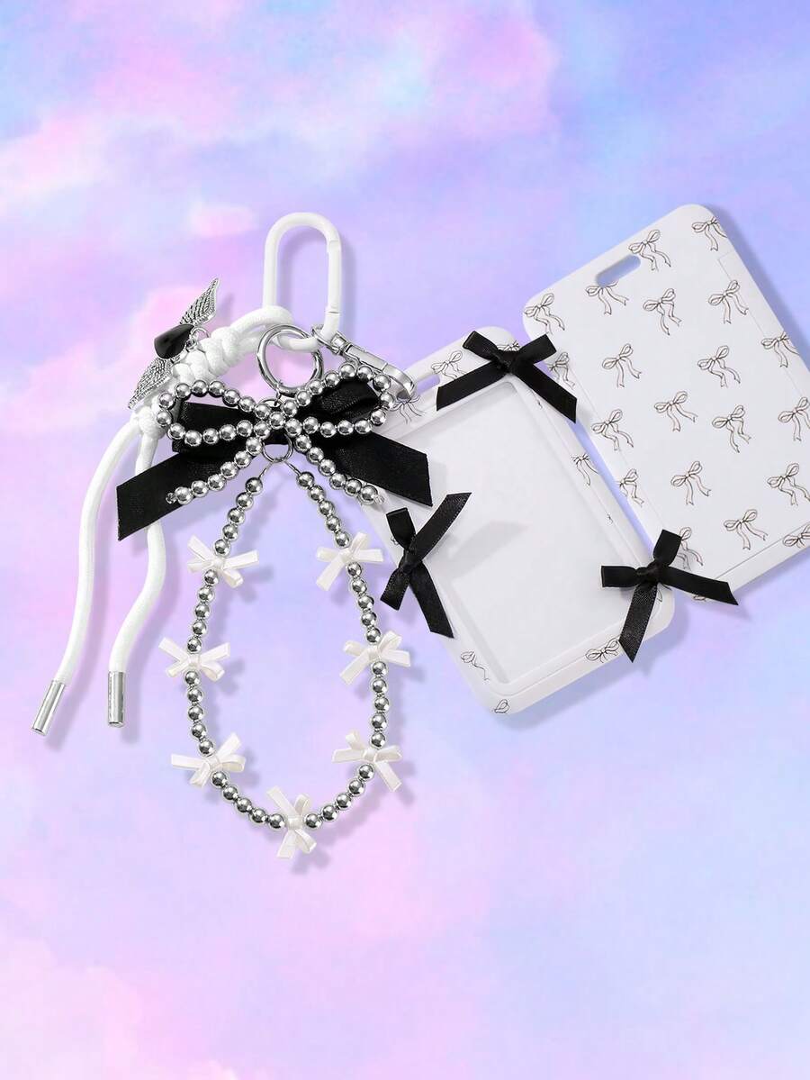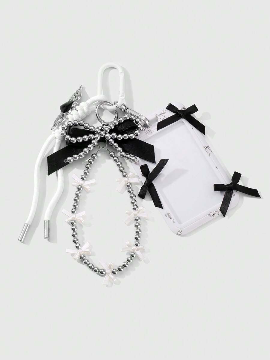 Kawaii 1pc Y2K Chic High-End Drip Painted Heart Wing Handmade Beaded CCB Woven Ribbon Resin Print Bow ID Card Holder, DIY Keychain & Keyring, Bag Charm & Phone Decor, Suitable For Women/Girls Daily Wear, Holiday Gift