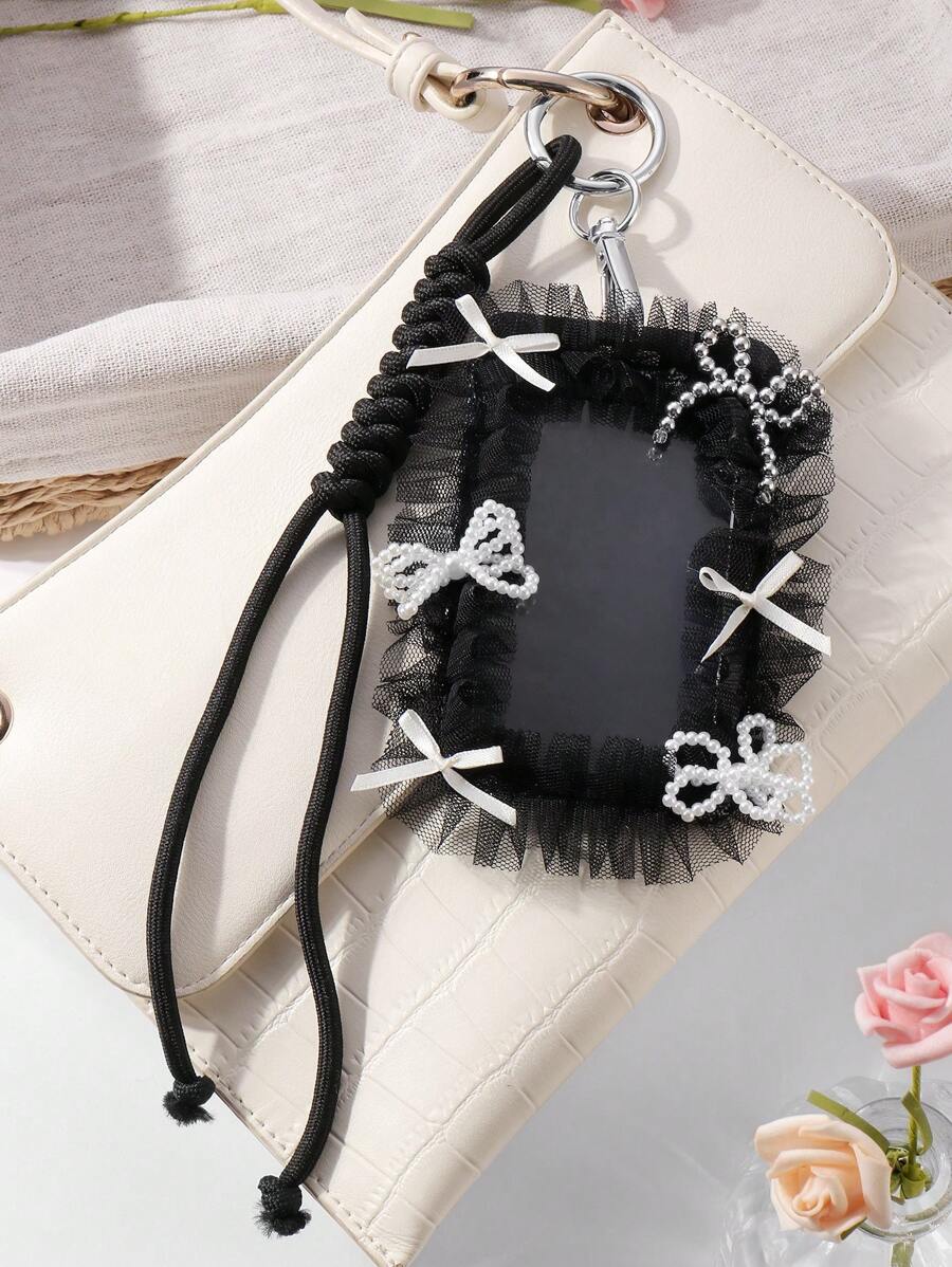 Kawaii 1pc Y2K Fashion Gothic Style Handmade Beaded White Faux Pearl CCB Ribbon Bow ID Badge Card Holder Keychain Bag Decoration, Suitable For Office Workers, Students, Daily Wear, Holiday Gift