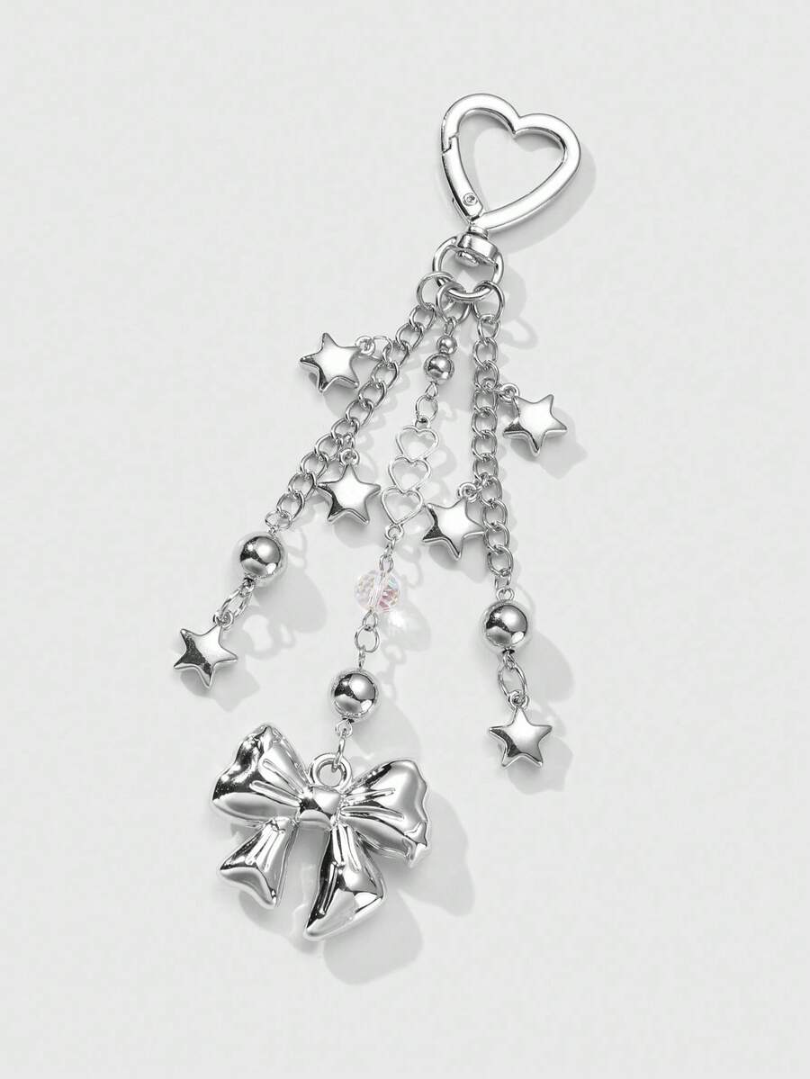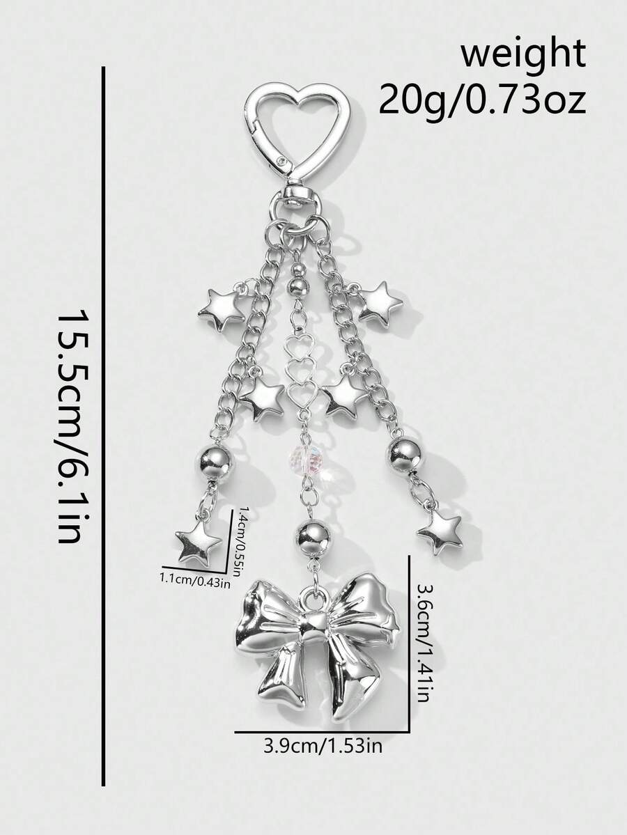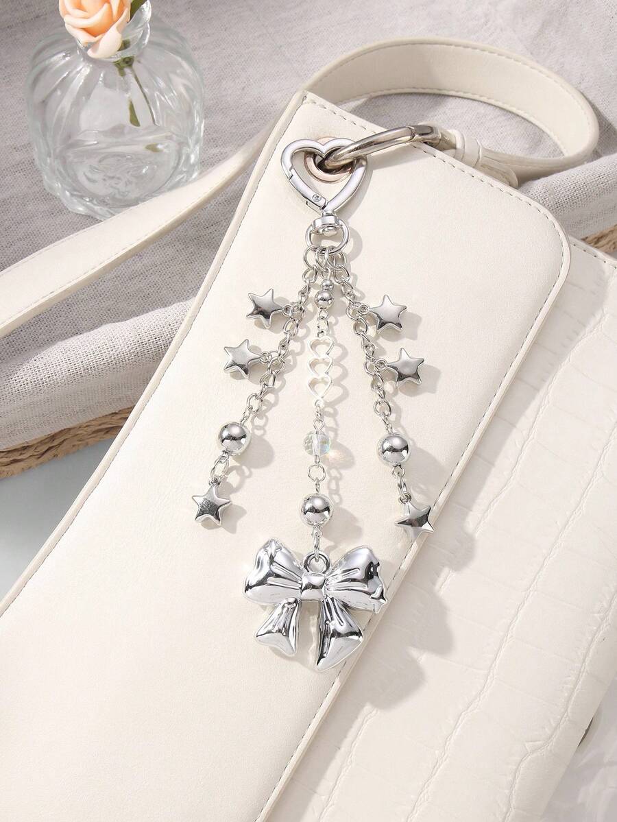 Kawaii 1pc Y2K Style Minimalistic Silver Hollow Heart Chain, Beads, Star, Bow Decor Keychain Bag Charm, Fashionable Accessories For Women, Suitable For Daily Wear And Holiday Gift