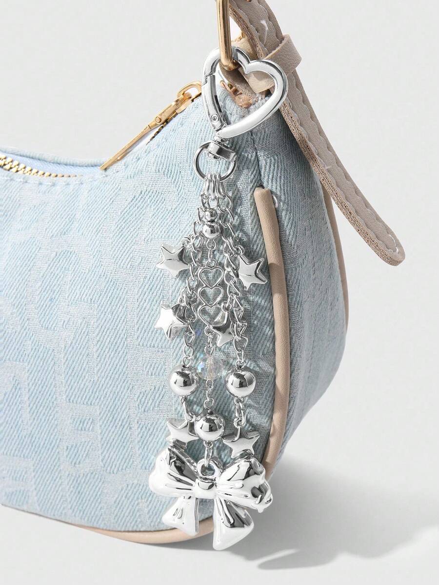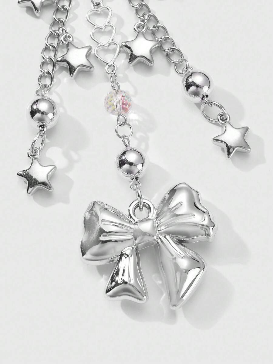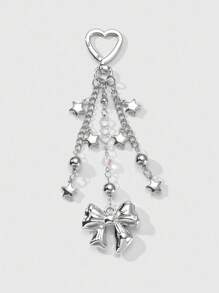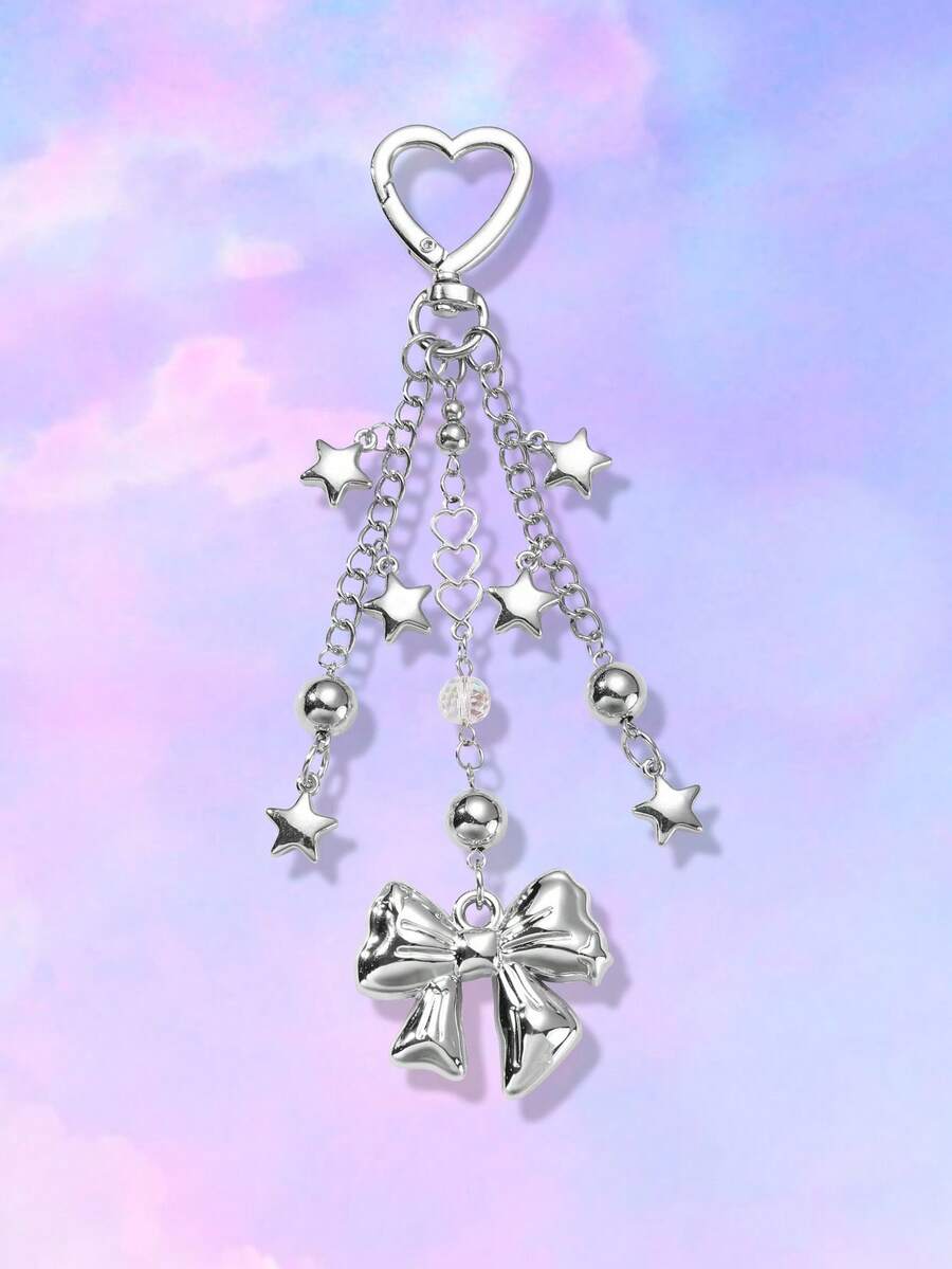 Kawaii 1pc Y2K Style Minimalistic Silver Hollow Heart Chain, Beads, Star, Bow Decor Keychain Bag Charm, Fashionable Accessories For Women, Suitable For Daily Wear And Holiday Gift