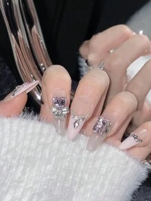 Kawaii 1set/10pcs Long Almond Shaped Full Cover French Style Nail Art With Rhinestone Decoration
