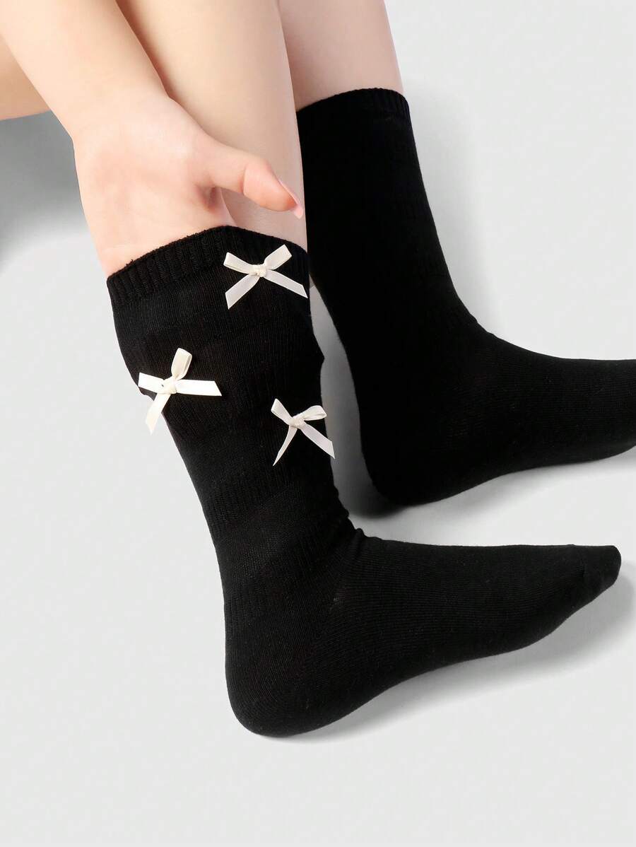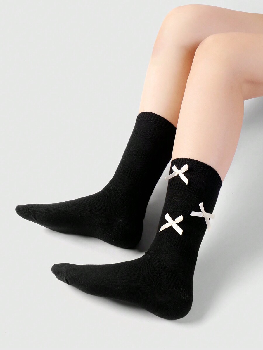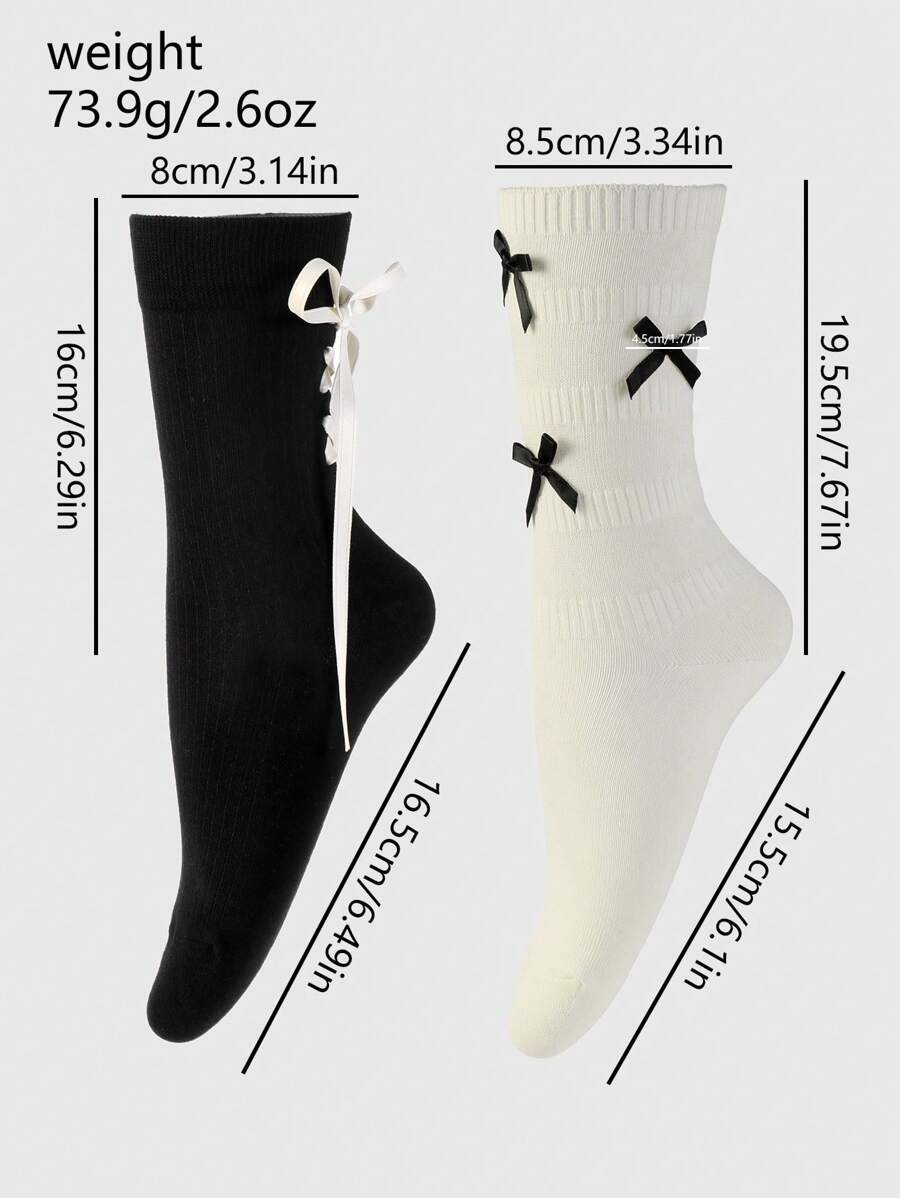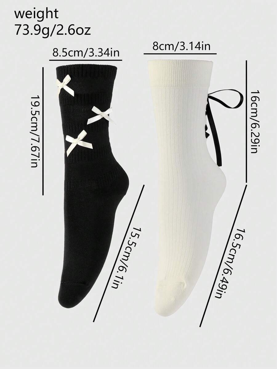 Kawaii 2 Pairs Korean Style Sweet Girl's Versatile Soft & Warm Black + White Ribbon Bow Decor Knee High Socks, Suitable For Women, Daily Wear Combination Set, Comes In Gift Box Packaging