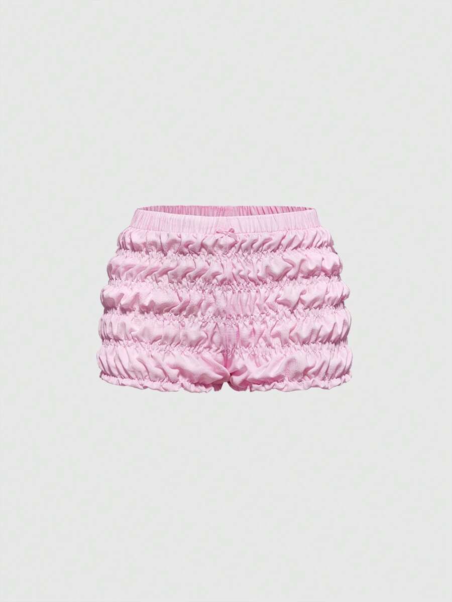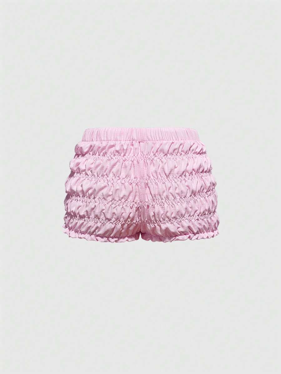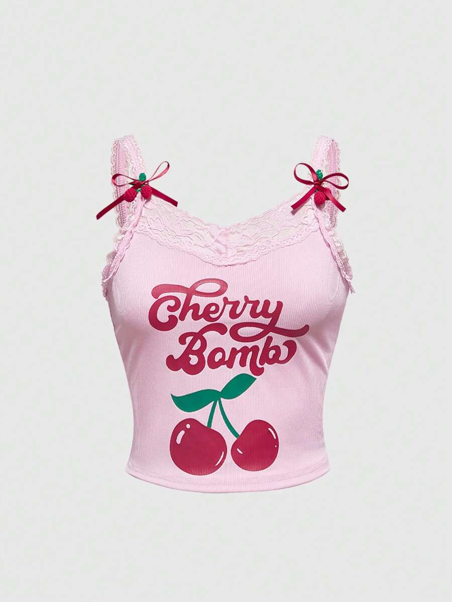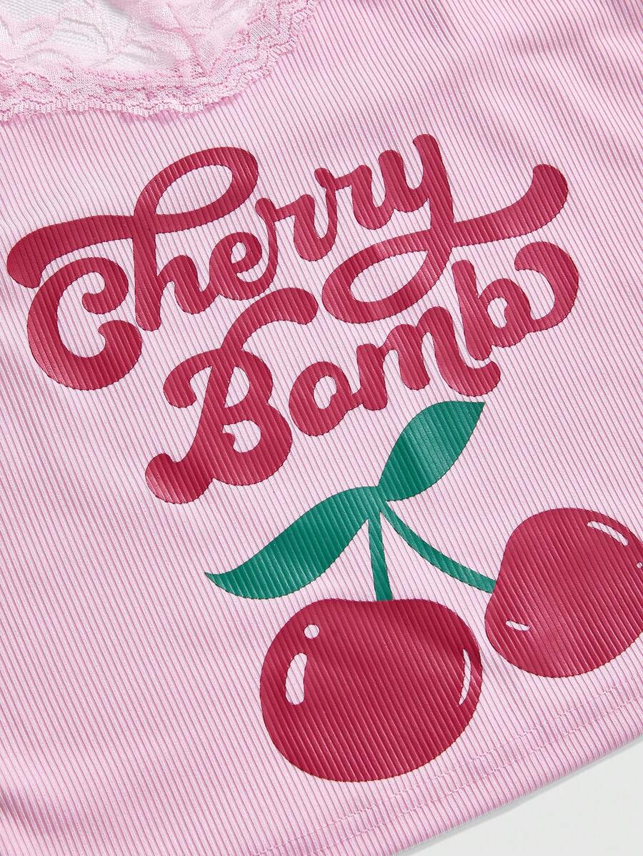 Kawaii 2pcs Cherry Print Lace Strap Tank Top And Ruffle Super Short Shorts Set, Casual Style For Young Women