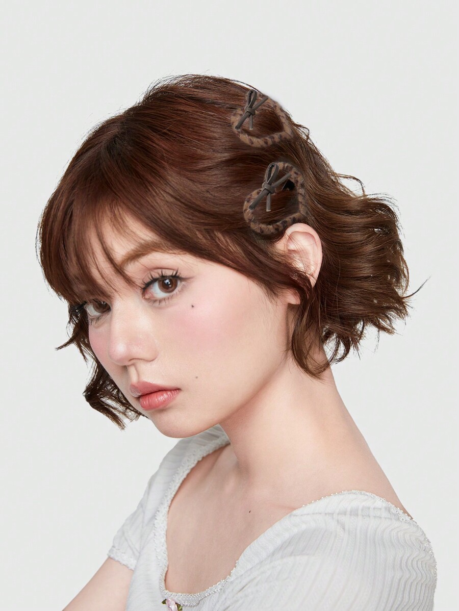 Kawaii 2pcs Korean Cute & Chic High-Quality Brown Plush Heart Leather Bowknot Decorative Hair Clip, Barrette Set - Daily Wear & Gift For Women/Girls