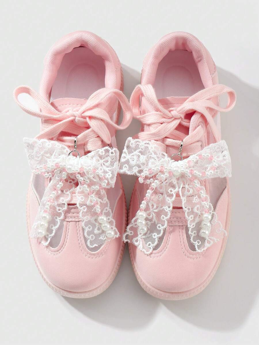 Kawaii 2pcs Korean Minimalist Elegant Handmade Beaded, Faux Pearl, Faux Crystal, White Lace Bow Shoe Clips, Versatile Fashion Accessories, Suitable For Women, Gift For Her