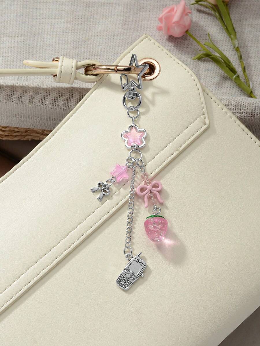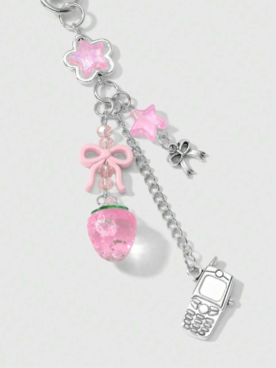 Kawaii 2pcs Korean Style Fashionable High-Quality Hollowed-Out Flower, Star, Strawberry Crystal Bow Decor Resin Phone Chain & Keychain Combo, Suitable For Couples, Best Friends, Everyday Wear, Holiday Gift