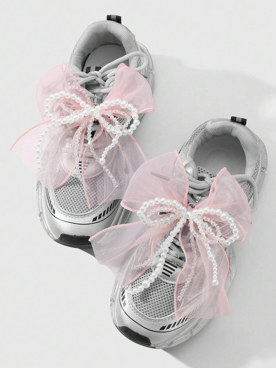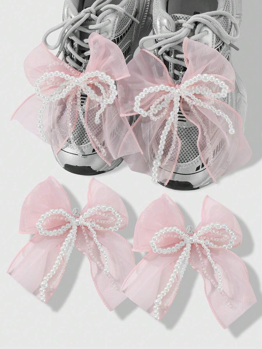 Kawaii 2pcs/Set Cute Sweet Girl Handcrafted Versatile High-Quality White Faux Pearl & Crystal, Pink Tulle Bow Shoe Clips, DIY Shoe Decor Combination, Suitable For Women/Girls Daily Wear, Festival Gifts
