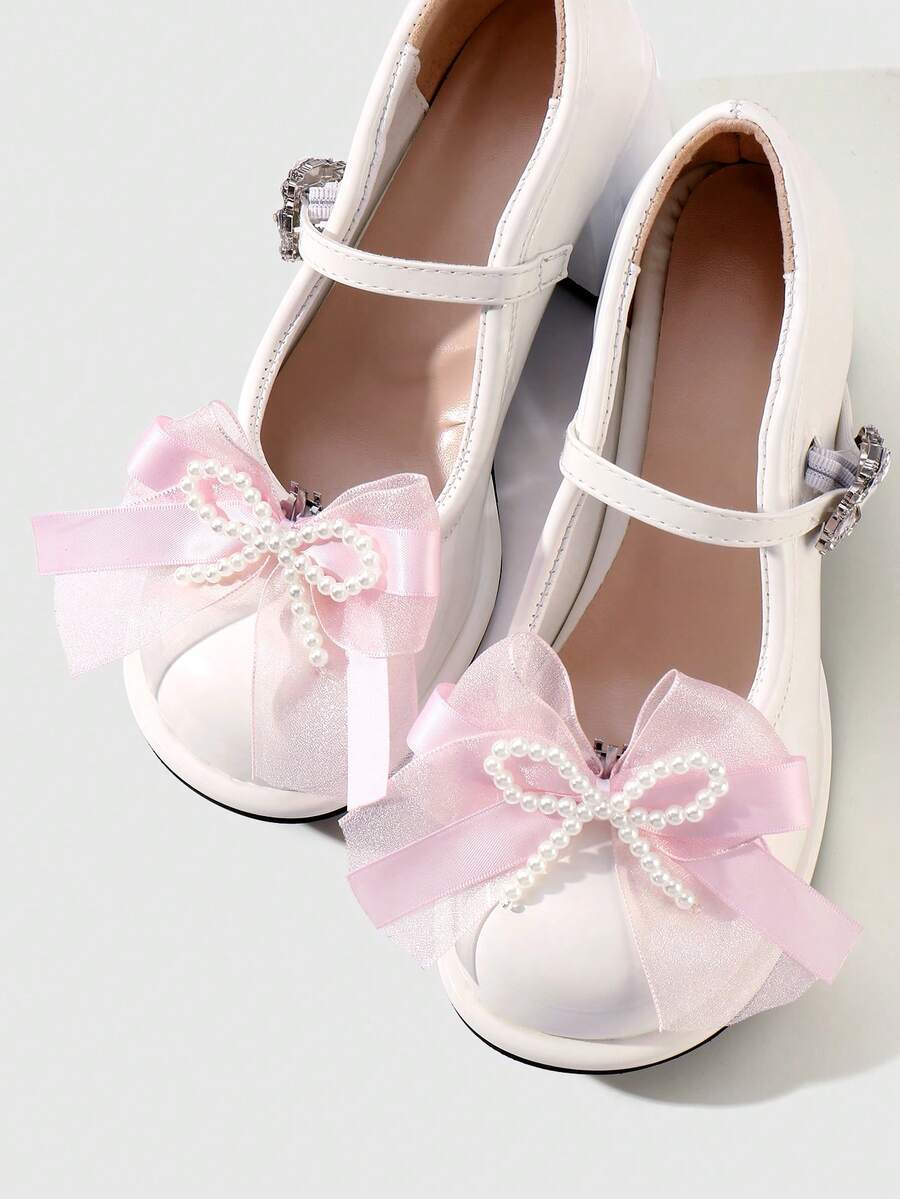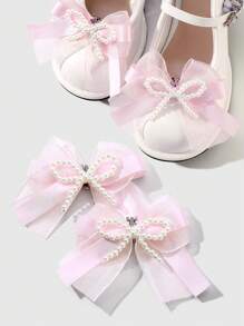 Kawaii 2pcs/Set Delicate Sweet Girl Versatile High-End Handmade Beaded White Faux Pearl Ribbon Mesh Bow DIY Shoe Clips/Shoe Decorations, Suitable For Women Daily Wear And Gift