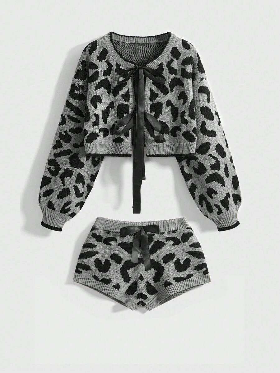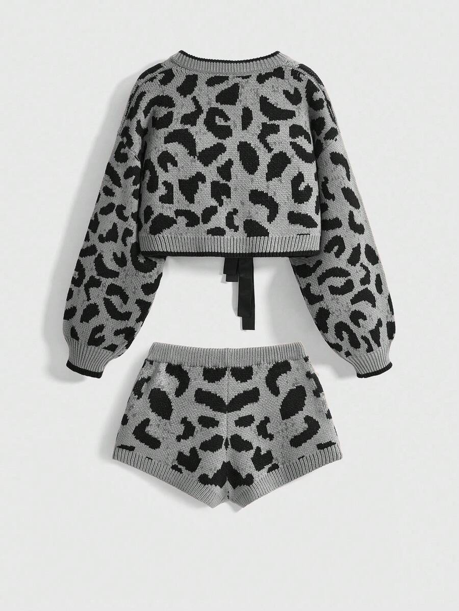 Kawaii 2pcs/Set Women Leopard Print Bow Decor Sweater