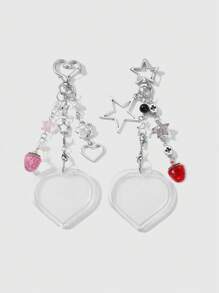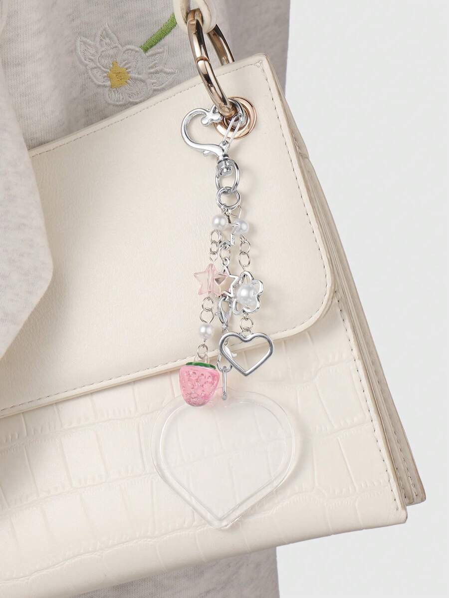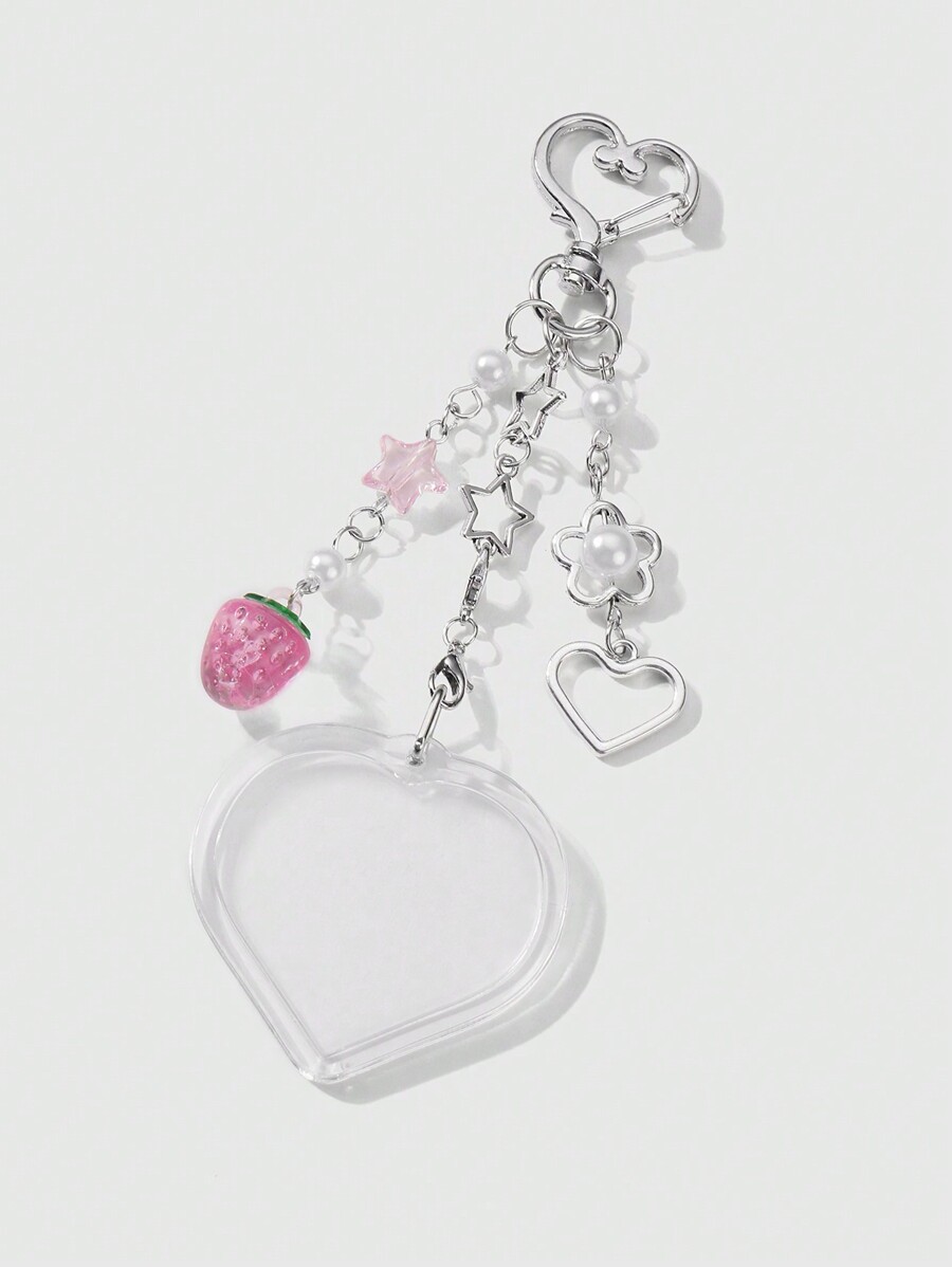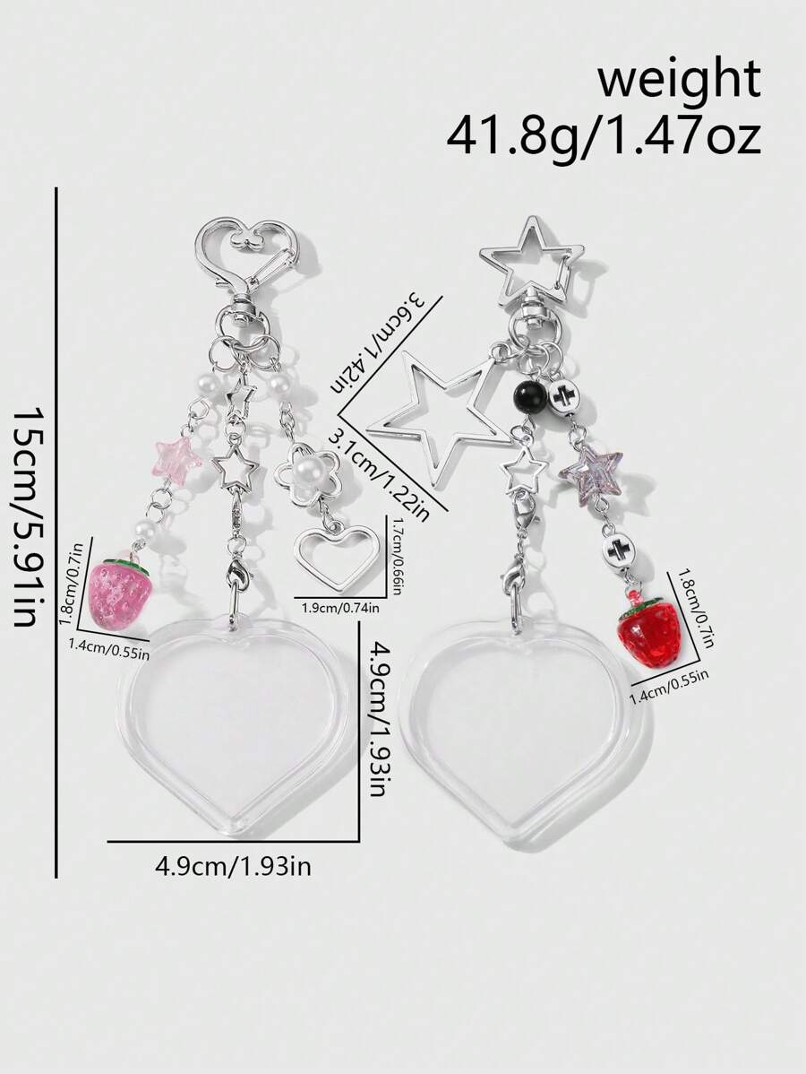 Kawaii 2pcs Y2K Chic Minimalist Versatile High-Quality Silver Star Chain Pendant, Faux Pearl Strawberry Heart Acrylic Photo Frame Keychain Bag Charm, Combination Set, Suitable For Couples, Best Friends, Sisters, Daily Wear, Holiday Gift