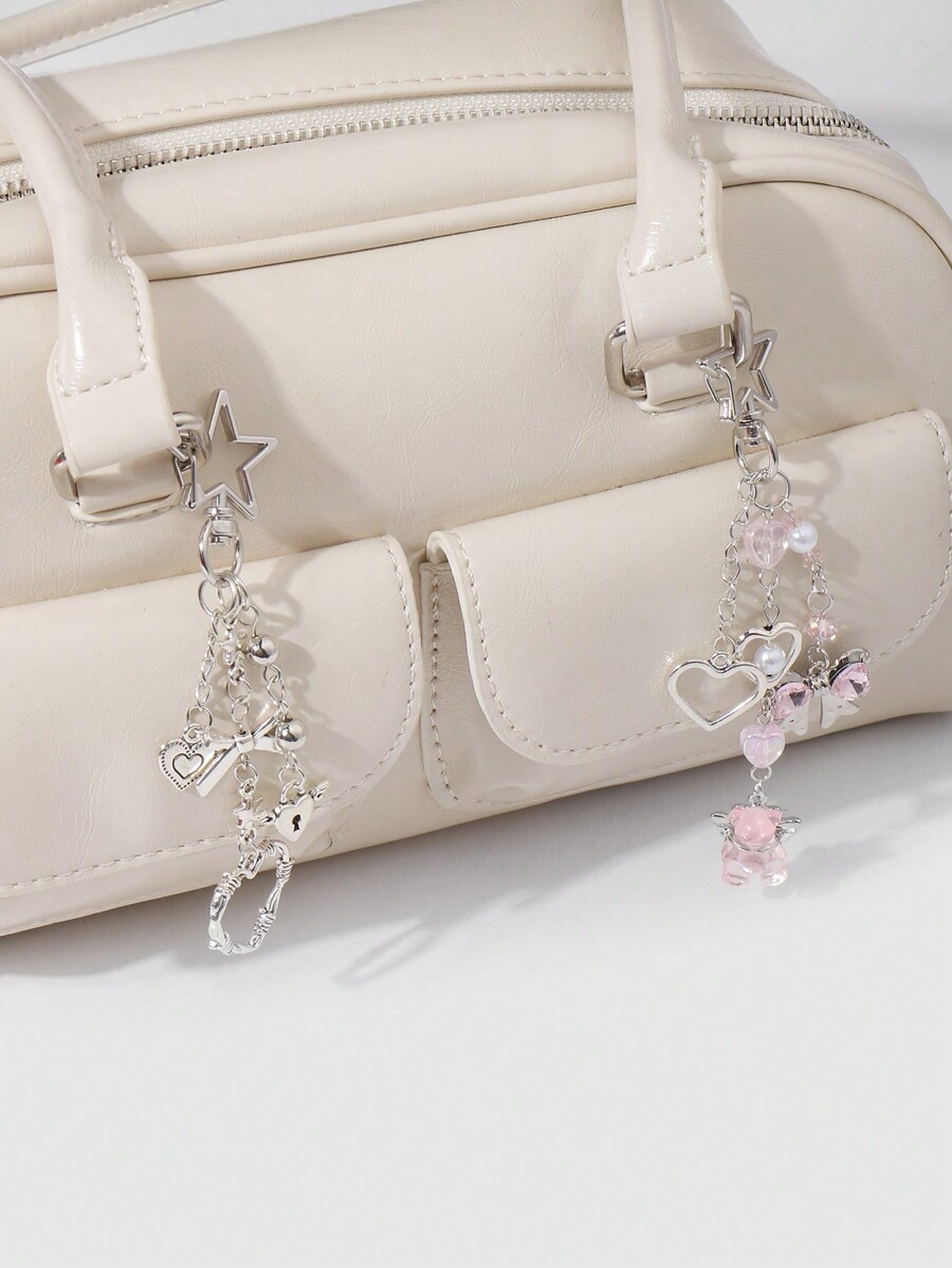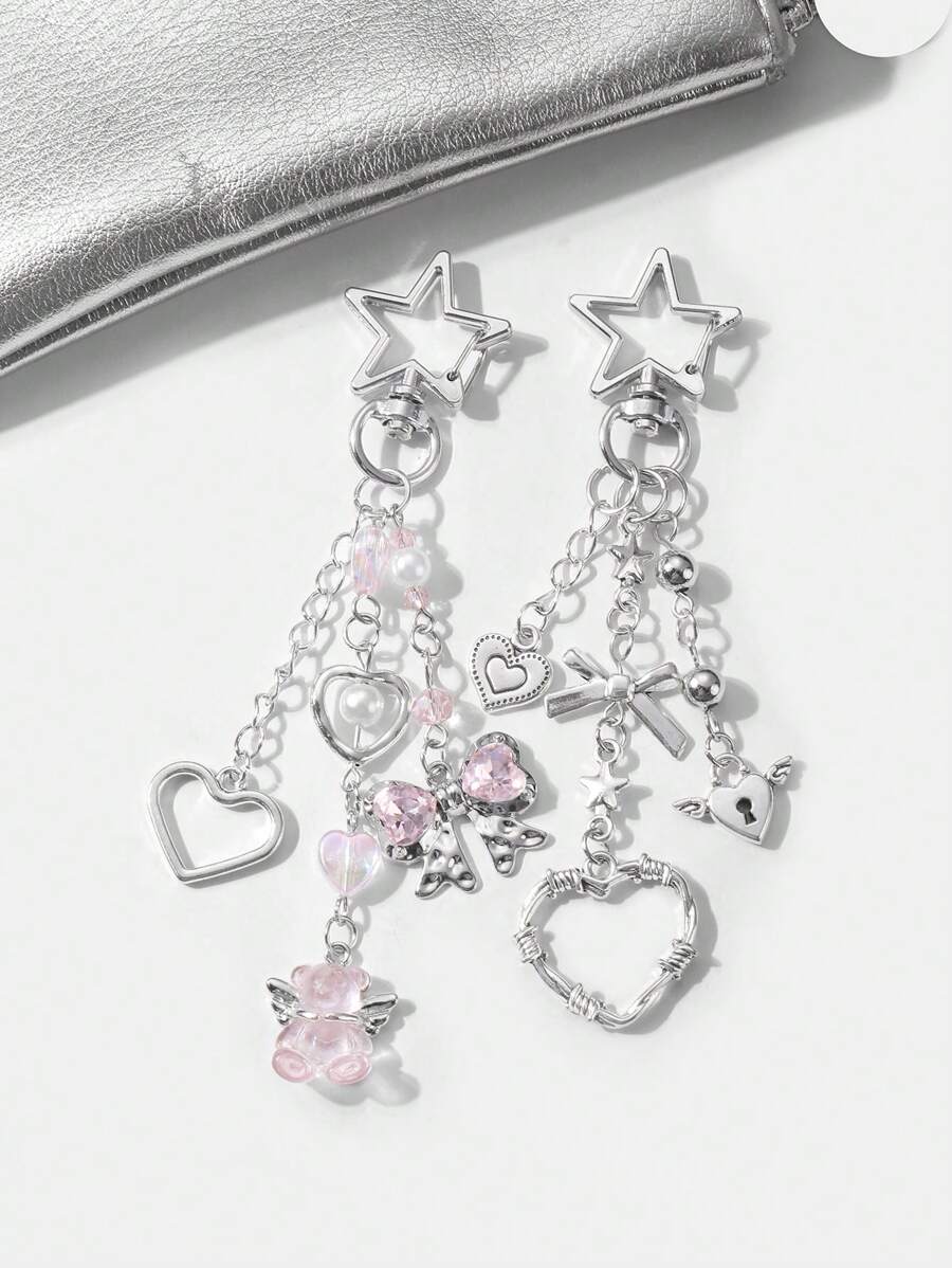 Kawaii 2pcs Y2K Chic & Stylish Silver Star Chain Hollow Thorn Heart Crystal Bow Butterfly Wings Teddy Bear Lock Key Chain Bag Charm Combo Set, Suitable For Sisters, Girlfriends, Couples, Friends Daily Wear, Festive Gift