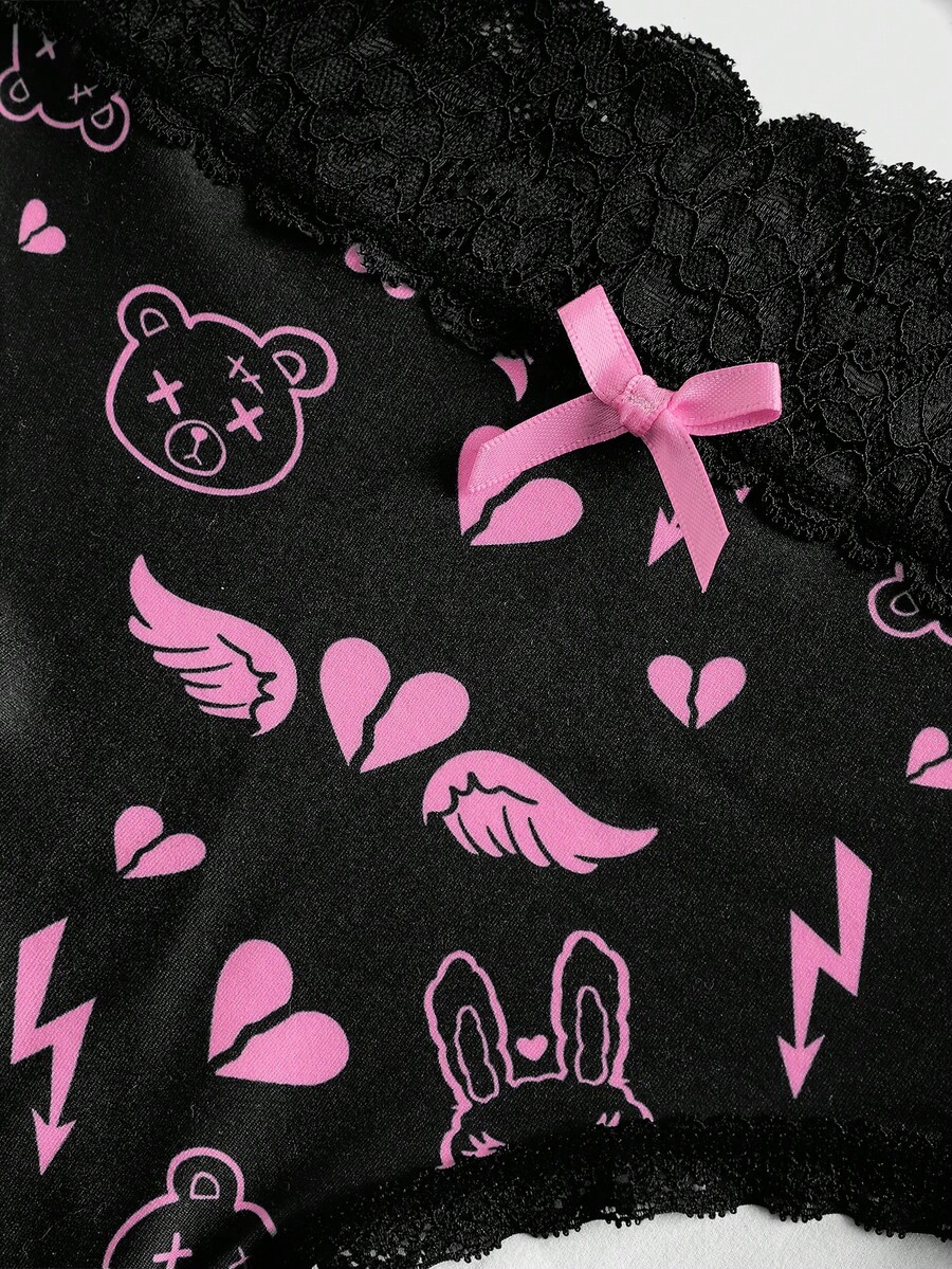 Kawaii 3pcs/Set Cute Bear, Heart Wing Lace Patchwork Women's Thong Panties Set