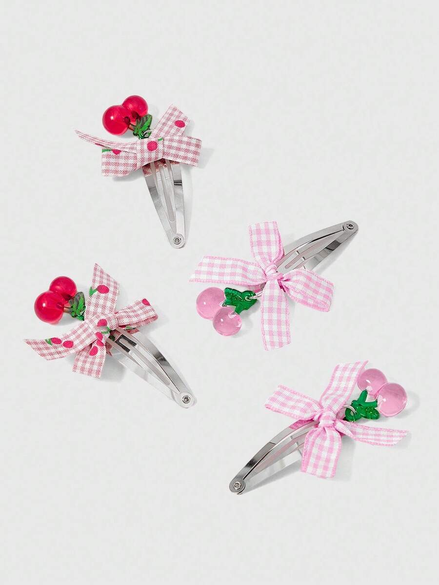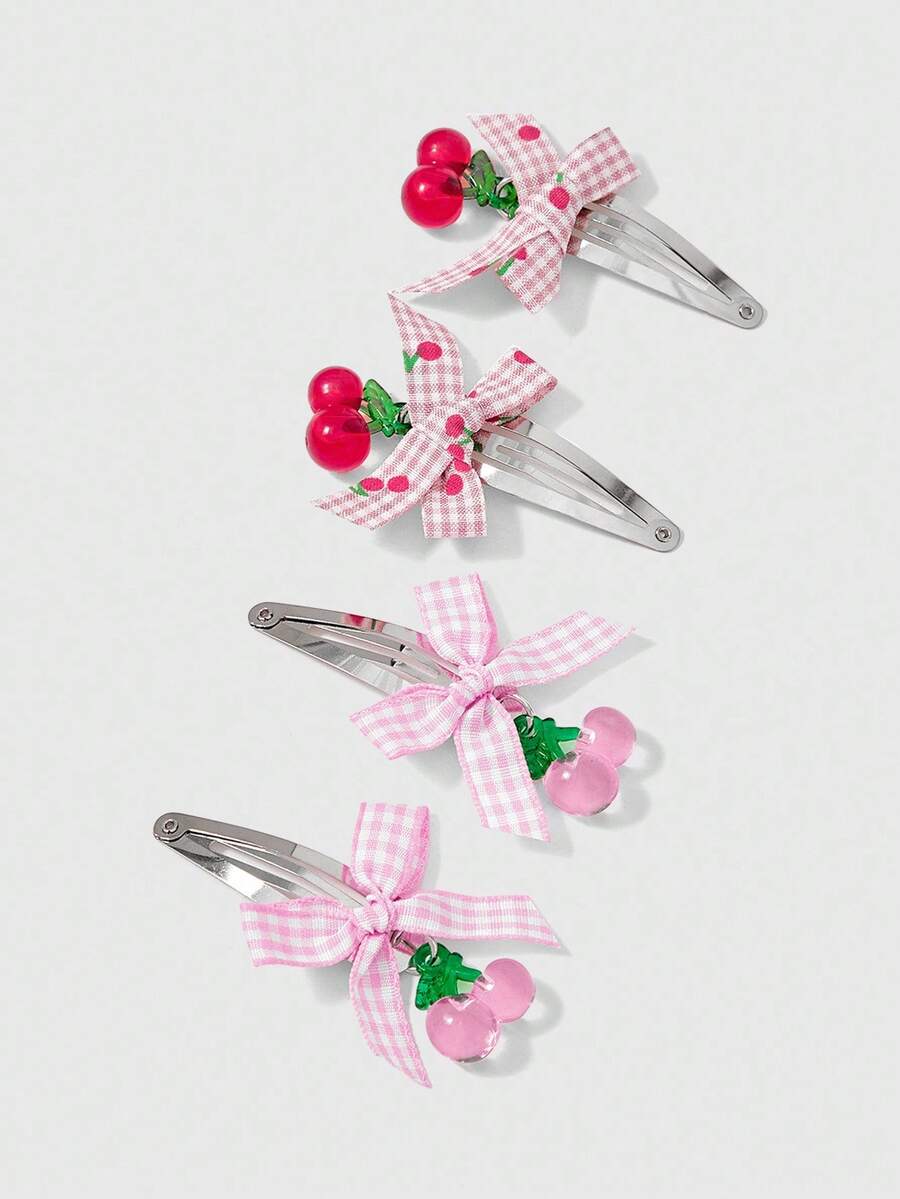 Kawaii 4pcs Random Color Cute Red & Pink Plaid Bow Hair Clips, Sweet Cherry Shaped BB Clips, Colorful Daily Creative Hair Accessories