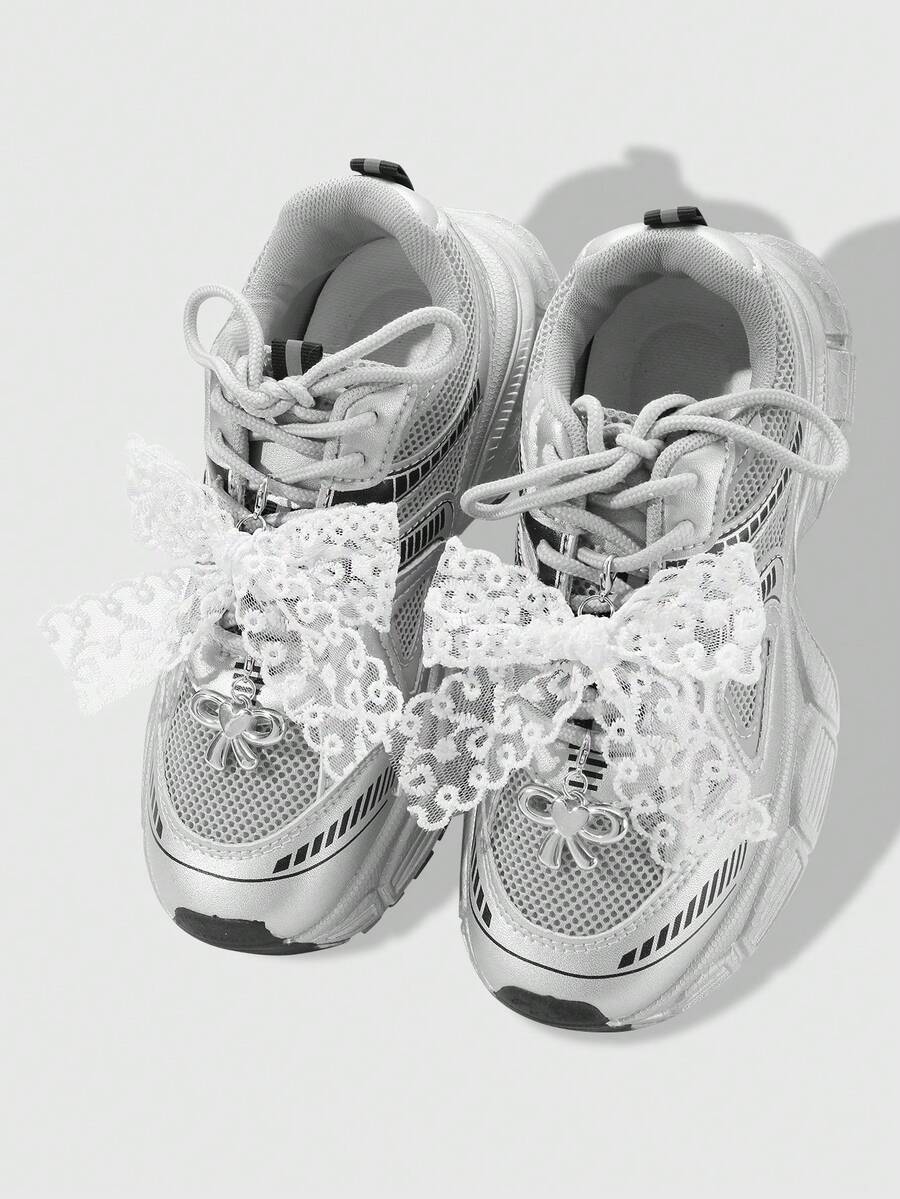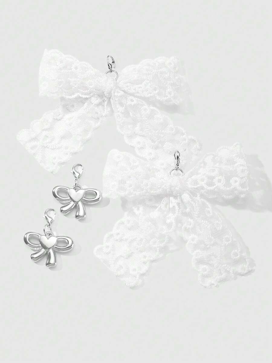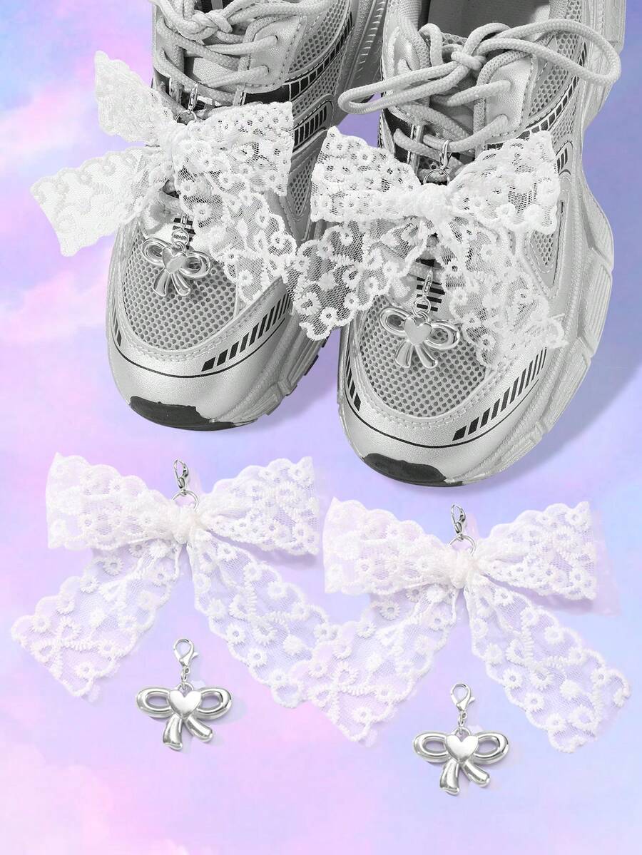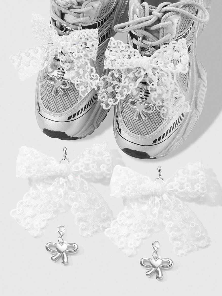 Kawaii 4pcs/Set Minimalist Versatile Exquisite Luxurious High-End White Mesh Embroidery Lace + Silver CCB Bowknot DIY Shoe Clips, Ornaments Combination Set, Suitable For Women, Daily Wear, Gift