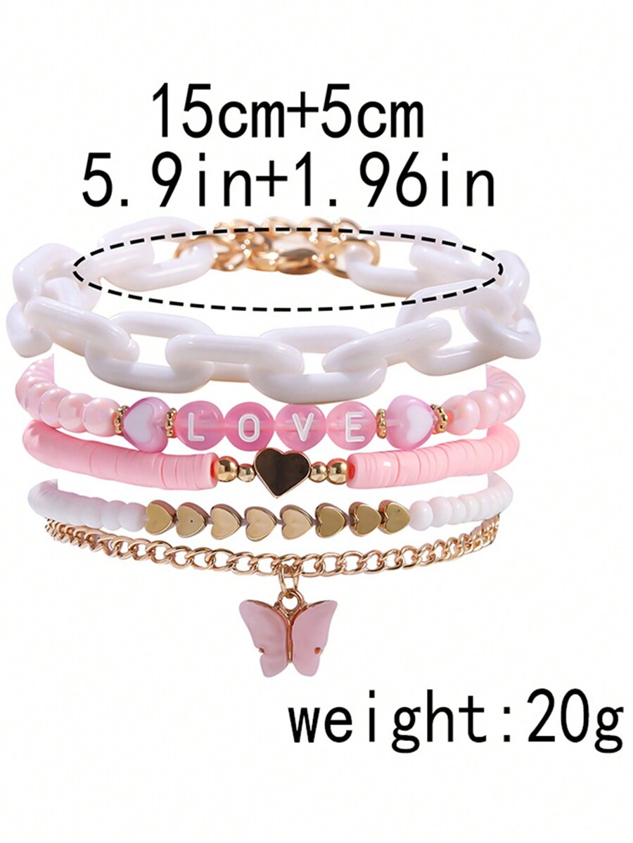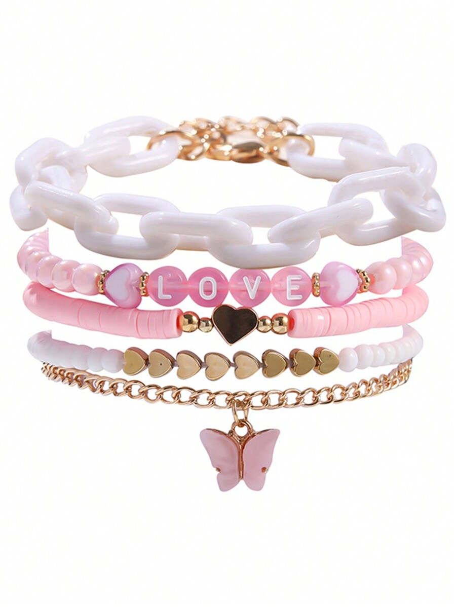 Kawaii 5 Pcs Valentine's Day Pink Beaded Chain Bracelet Set For Women,Mom,Mother,Mother's Day,Gift