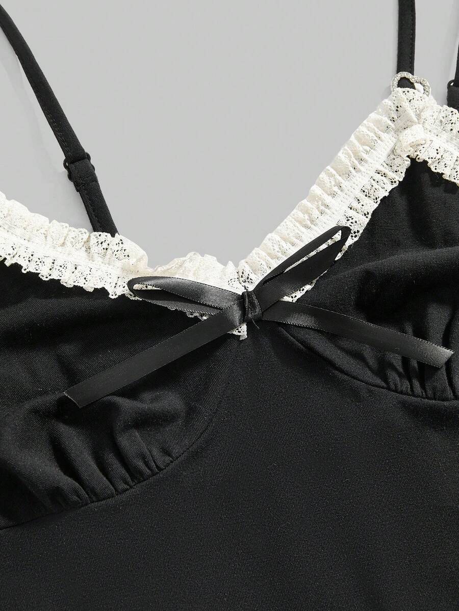Kawaii Basic Lace Patchwork Bow Rhinestone Decor Fitted Cropped Women Tank Top