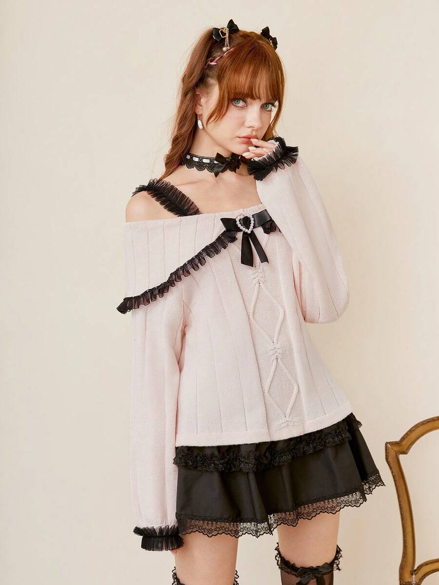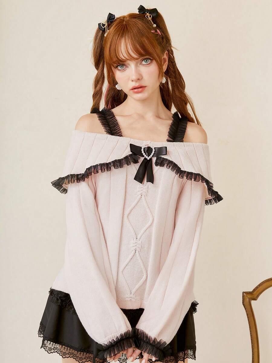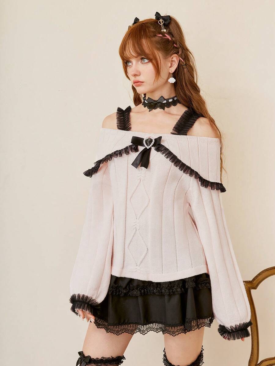 Kawaii Bow Decor Cold Shoulder Frill Trim Sweater